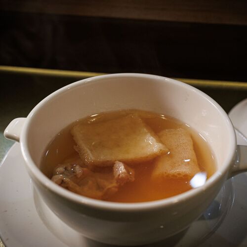 Owner-chef, a Keio University graduate, became a chef from his dreams of being an artisan; a person who can accomplish one thing can do anything. Flame-broiled items finished in the massive oven are a gift acquired through many labours as a hotel chef. Fujii cuts a deft and poised figure in the kitchen, master of both theory and practice. He claims his mother vehemently opposed his choice of career, but when he beholds the joy of his guests, his face is the picture of happiness.