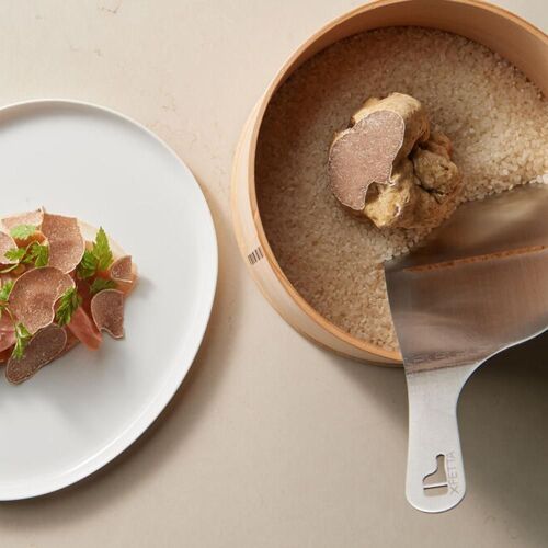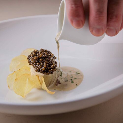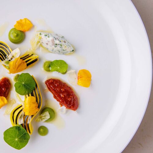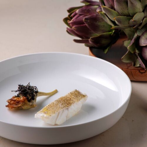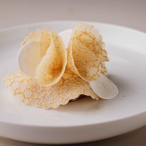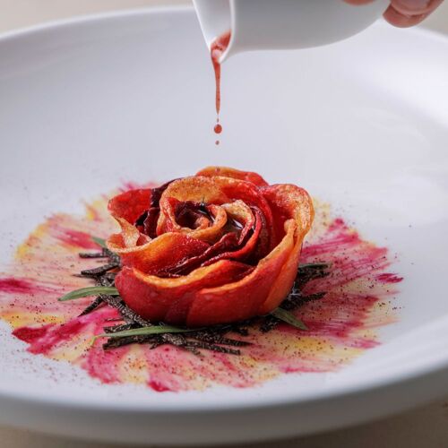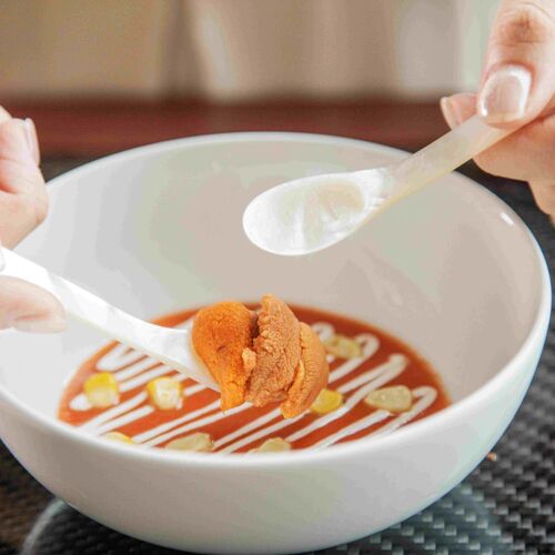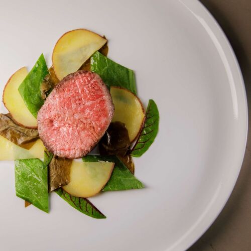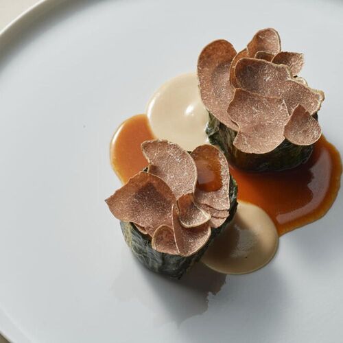 Perched on the hotel’s top floor, the dining room affords stunning views of the city below. The modern kitchen, visible through a curtain-glass wall, is full of motion. Chef Guillaume Bracaval creates contemporary French expressions inspired by Japanese ingredients and culture. The map of Japan indicating where the various ingredients come from proclaims the bounty of Japan’s landscape. Desserts are a gorgeous flourish of contemporary art.