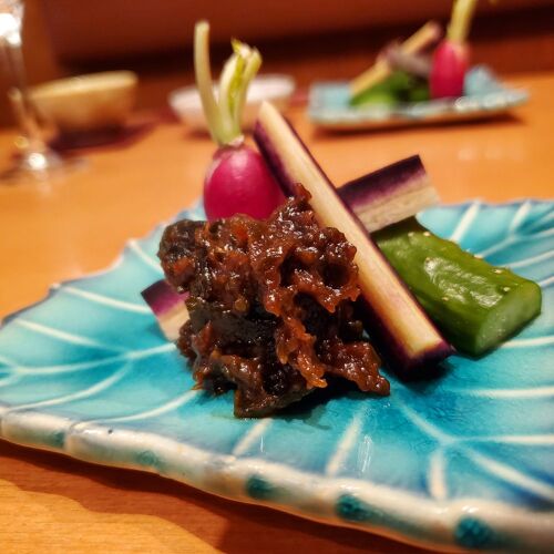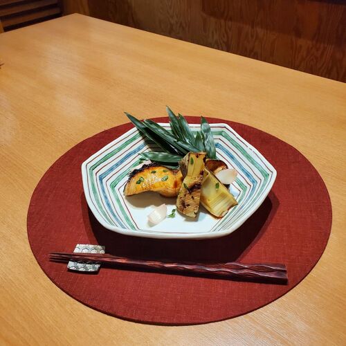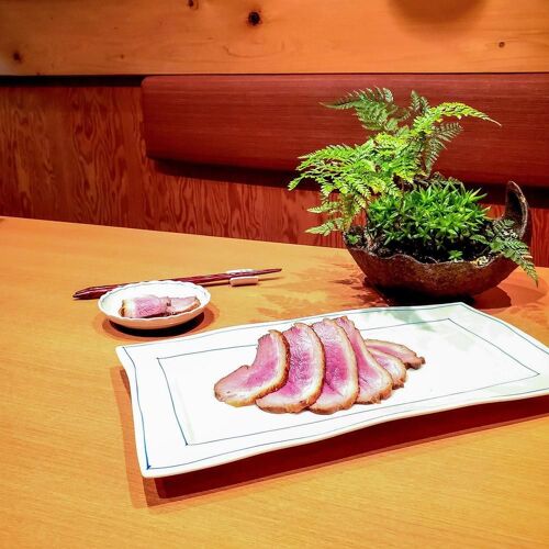 The friendly couple who run Kuhara—the chef a disciple of Japanese cuisine, the proprietress a welcoming figure in kappo wear—make us instantly feel at home. The signature fare is duck. In addition to salt-grilled duck, they offer chilled breast stew in summer, and a hot duck stew called jibuni in winter. Dried baby fish with soy and pepper on rice and Kokusho miso soup of root vegetables are must-try items. Unripe pepper is gathered by the couple and their children when they visit her hometown in Tochigi Prefecture. Kokusho miso soup brings back memories for the chef, who sampled it when he applied to a restaurant specialising in shojin ryori.