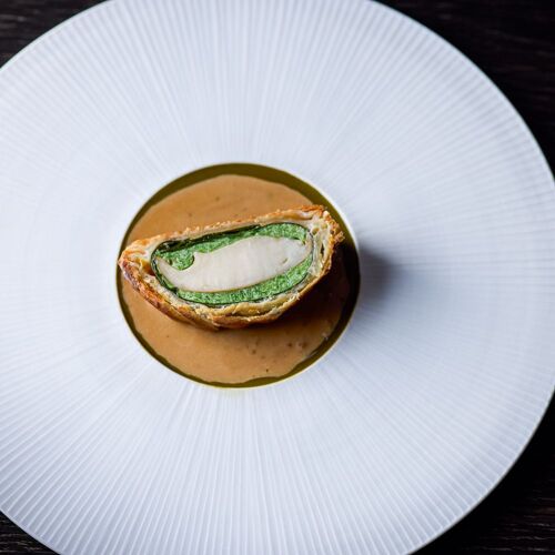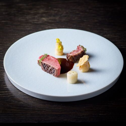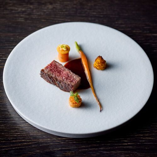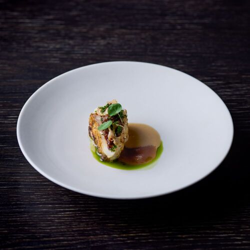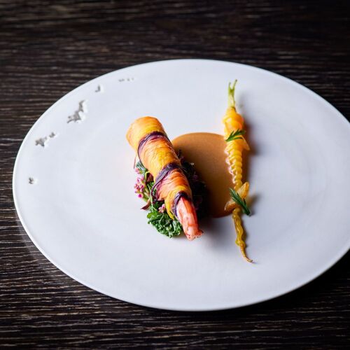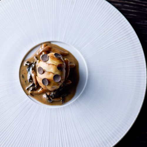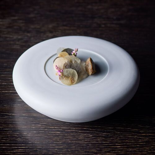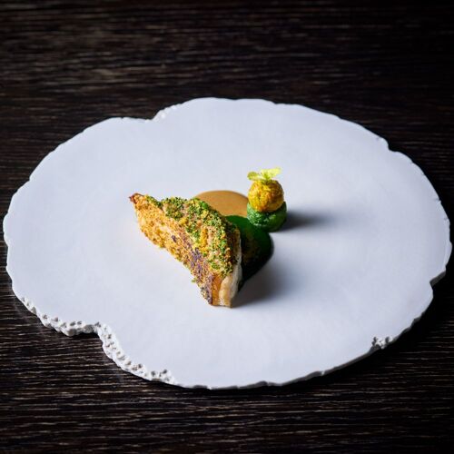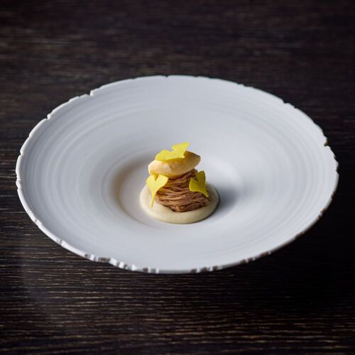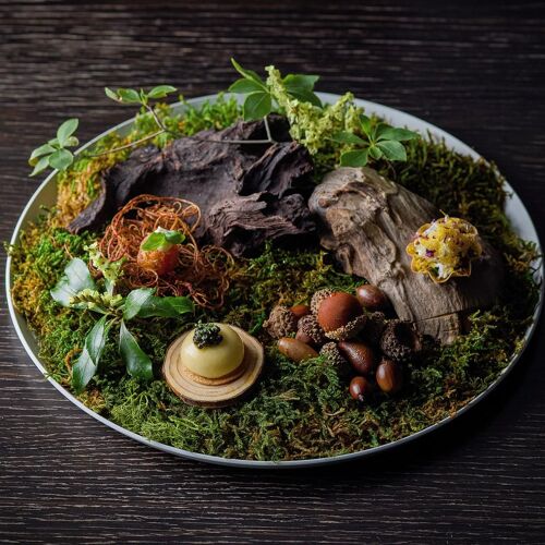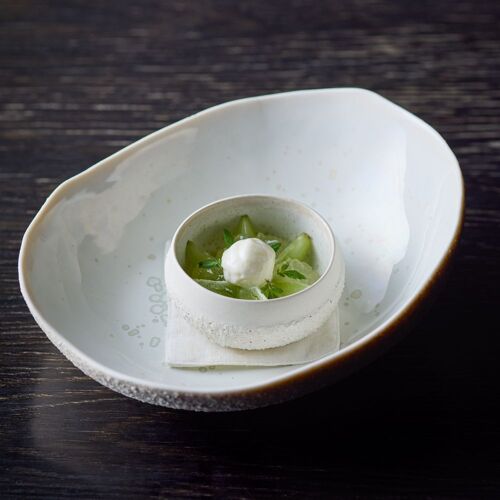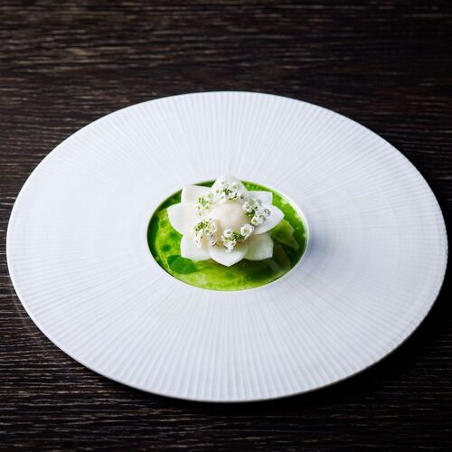 The whole restaurant is a canvas on which Takamitsu Shimizu expresses his love of nature. Driftwood and charcoal adorn the stone walls and the cuisine celebrates the seasons, stirring the senses. ‘Water, Leaf, Soil, Tree,’ an amuse bouche, drives this concept home. On dishes moulded in the shapes of mosses and plants are served bite-sized pieces of the bounty of mountain and sea. The appeal of each producing region and producer is on display here, appreciated through the chef’s own filter.