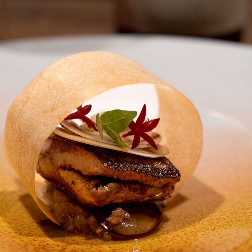 Imola, the city in Italy’s Emilia-Romagna where the chef apprenticed, has a famous music academy. The restaurant’s name derives from the passion for classical music he learned from the students he befriended there. In Imola, the chef developed his belief that a restaurant resembles an orchestra, in that a wide range of players work in harmony to create a greater whole. Cuisine on plates decorated with musical instrument motifs and classical music piped into the dining room deliver a performance worthy of any conservatory.