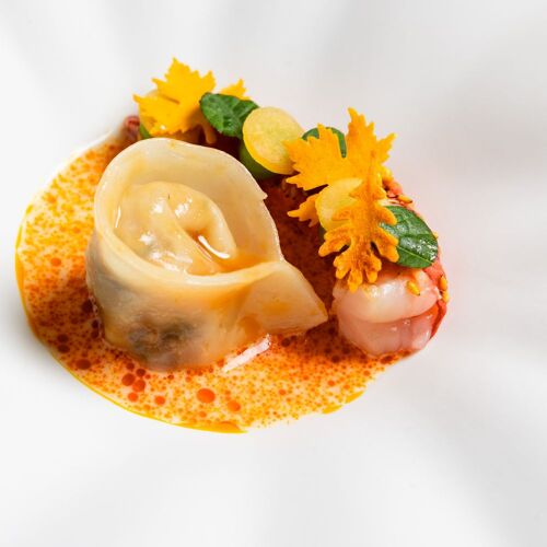 The clean, minimalist design immediately catches the eye, as do the striking brick arches overhead. Seated at attractive solid wood tables in a pleasantly relaxed setting, diners have a clear view into the open kitchen – and they can see just how dedicated Fabian Günzel and his team are! The pared-down interior is reflected in the numerous modern and creative courses of the set menu. The wonderfully succulent charcoal-grilled Atlantic turbot is an excellent example of the emphasis placed on premium ingredients – delicately aromatic and perfectly seasoned, it is served alongside lightly sautéed New Zealand spinach, firm trout caviar and creamy warm yogurt with grated Sicilian almonds. The appealing and extensive wine list includes intriguing pairings tailored to the set menu.