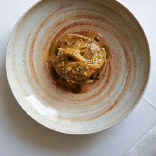 This charming restaurant is built on the site of an old 18C olive oil mill (part of which is still used as a convivial wine cellar) in a secluded and tranquil location. The rest of the building is modern, elegant and colourful, while the delightful outdoor space boasts a garden overlooking the surrounding hills and olive trees. Since early 2024, a former sous-chef here has returned to take over at the helm in the kitchen, where he creates dishes that mirror the modern simplicity of the setting. He offers a carefully prepared blind tasting menu (booking ahead is mandatory and you choose your number of courses when you book) that focuses on local ingredients and makes ample use of vegetables.