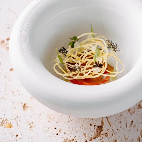 An oyster shell filled with a goose liver crémeux topped with raw oyster pieces and an apple brunoise, accompanied by a sea buckthorn cream with sambal and oyster juice foam – this is the kind of inventive, highly technical creation that demonstrates Mike Cornelissen's talent. Representing the fourth generation of his family to run this restaurant, he has made it entirely his own. The interior has been transformed into a sleek and stylish space, but the terrace has retained its original charm. But it is his creativity and the beautiful presentation of his dishes that are most remarkable. The beautifully plated dishes are visually arresting. His imagination knows no bounds. Fantastic local produce such as trout from 't Smallert farm and Betuwe cherries are expertly combined with international seasonings. This is a unique culinary adventure that you conclude by toasting a marshmallow yourself on a table-top charcoal fire. The innovative set menu is updated every three months, surprising and delighting diners every time.
