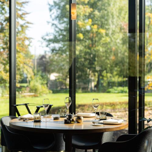 You will be conquered by Le Vieux Château and its drop-dead surroundings before you have even taken a seat. Once over the moat bridge and past the huge oak door, it is impossible not to fall in love with the interior which intelligently and tastefully marries authentic period details such as timber ceilings with a light, contemporary vibe, while the glazed extension commands unfettered views over the garden and countryside. Once you are comfortably seated, you can bask in the slick service and infinite creativity of chef Tanguy De Turck. The chef refuses to limit himself to a single style. The meal may kick off with generous street food, before moving onto a ceviche or a bao of seabream, or a textbook-perfect pheasant on the bone. The vegetarian menu unveils the chef’s passion for veg as he rolls out a head-spinning array of techniques to transcribe his ideas into dishes, resulting in delicate, insightful and fascinating creations. Examples include breaded turbot cooked on a plancha, flanked by a tempura of mussels and a mussel sauce oozing in character, with a nori and oyster leaf mayonnaise which further enhances the dish’s briny dimension. Throughout the meal, you are invited to select bread from an amazing bread trolley (don’t miss the focaccia!). The score of this precise, generous and unorthodox chef is exalted by the intuitive wine pairing tips of the daring sommelier.