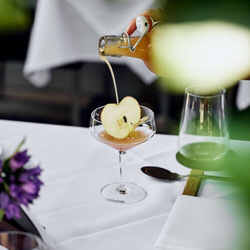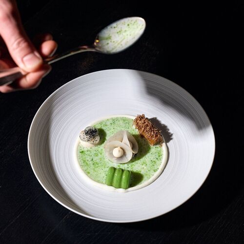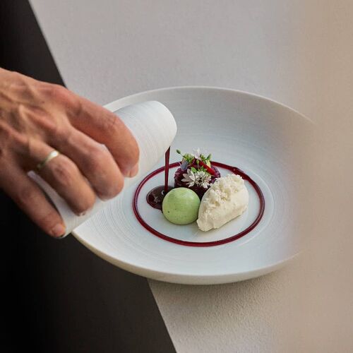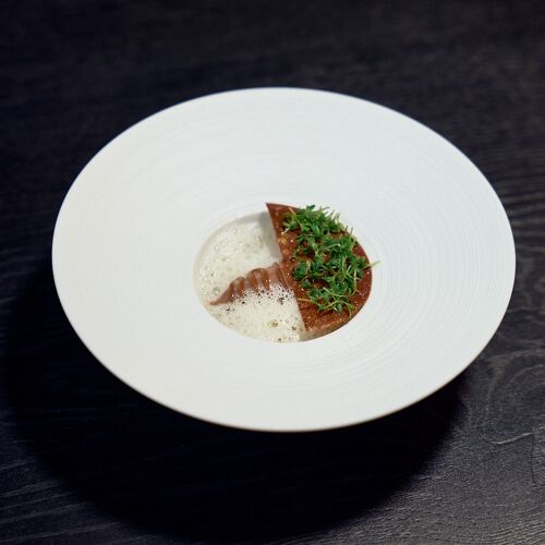 Maurizio Oster is (the name of) the chef-owner of this modern, sleek, almost minimalist-style little restaurant. His North German roots are also reflected in his cuisine – the guiding philosophy is clear: the produce always takes centre stage. Excellent ingredients, sourced primarily from small producers and organic farms in the immediate vicinity go into seasonal, plant-forward dishes that are sustainably prepared. There is a set menu including fish and meat, as well as a completely vegetarian version. Both can be extended with the delightful extra courses "Die Forelle zelebriert” (trout) or "Der Kohl zelebriert” (cabbage) respectively. Dishes such as "onion, lovage, quinoa" are meticulously crafted and artfully presented, yet pared down and brimming with bold flavour – a unique culinary identity is evident. The kitchen team also has a real penchant for fermenting, preserving and making vinegar. Service is attentive yet relaxed. Astute wine recommendations. The set menu can also be paired with house-made non-alcoholic drinks.
