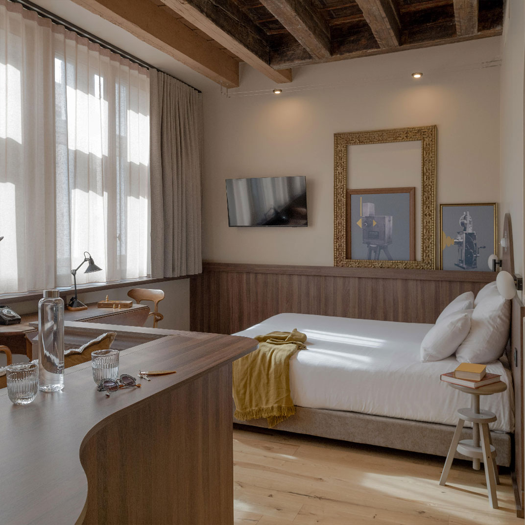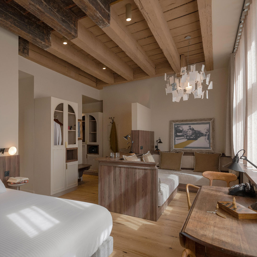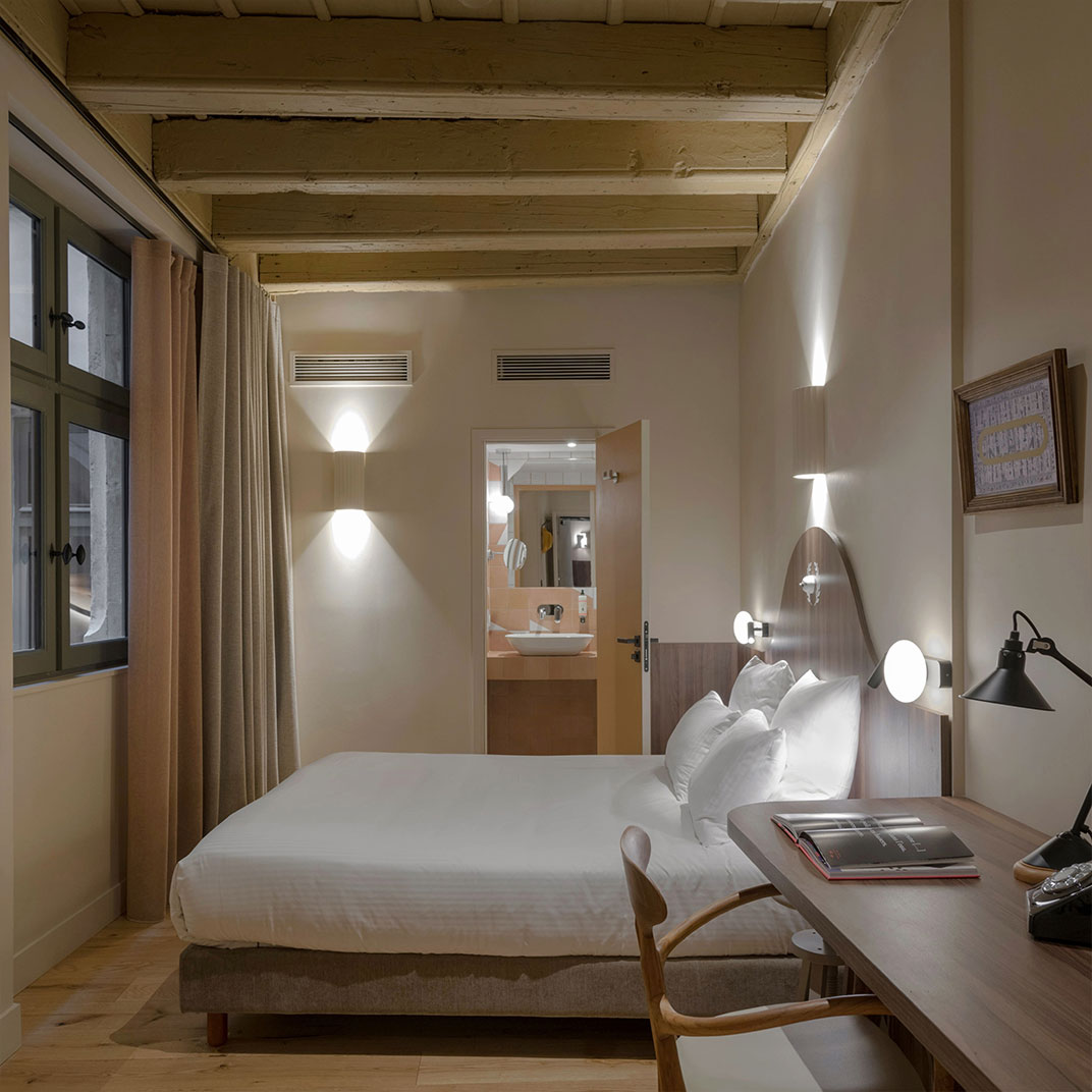 Housed in a restored 15th century property, Académie Hôtel Lyon is full of the same historic charm as the cobbled streets that surround it. Situated in Vieux Lyon, Lyon’s UNESCO-protected old town, the hotel still retains many of its centuries-old design elements, including its listed courtyard, arched stone doorways, and a sculpted coat of arms. Given the age of the building, rooms are understandably on the smaller side, but feel cozy rather than cramped, with parquet flooring, wood panelling, and the original French beamed ceilings. There’s no restaurant — although you can stop by for a drink at the cocktail bar linked to the hotel — but you won’t be short of options in Vieux Lyon, which is one of the city’s gastronomic hotspots.