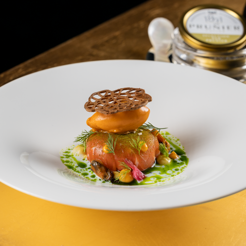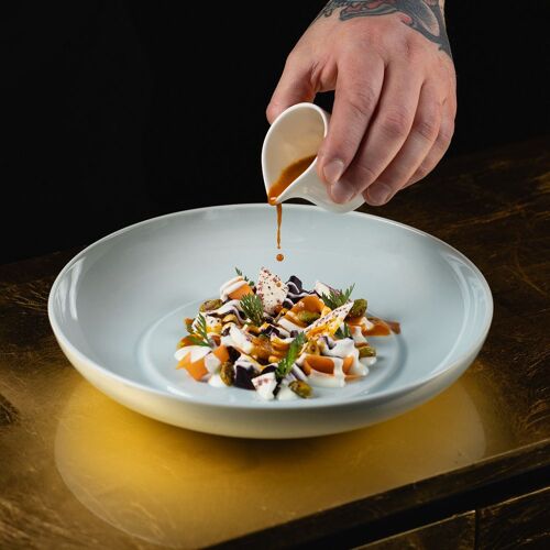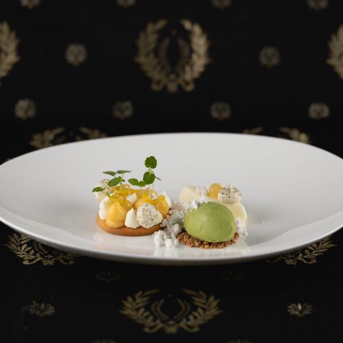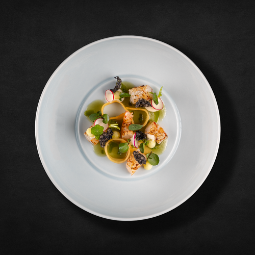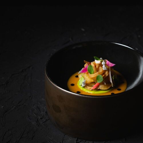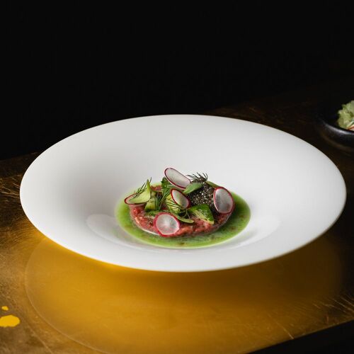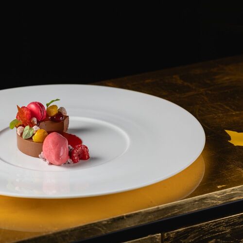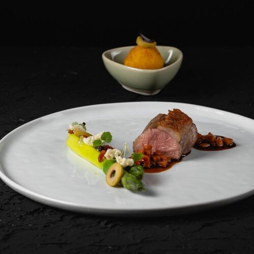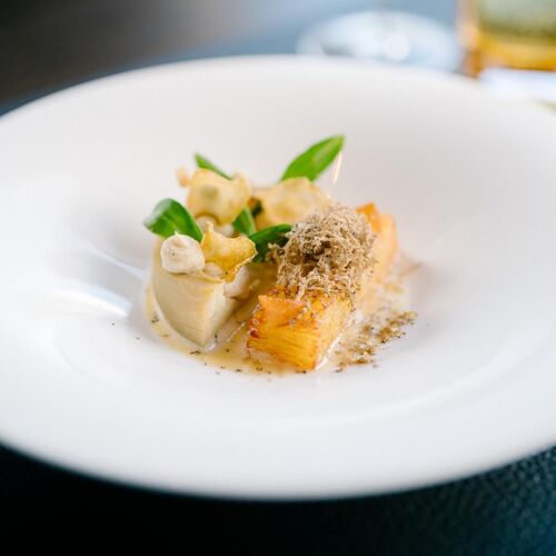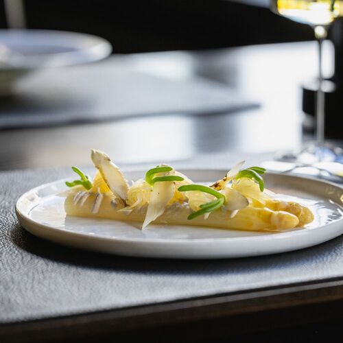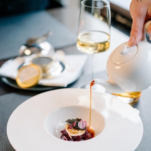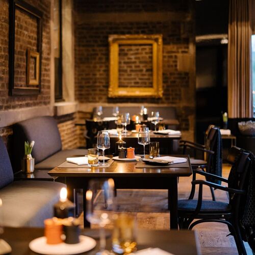 Even the route to the magnificent moated castle, a 17C architectural gem, is an experience – you get to this stunning estate through a wooded area, then a bridge over the moat leads into the beautiful inner courtyard. The restaurant allies the character of this site steeped in history with modern comfort and winter garden-style. The view through the large glazed front is fabulous, not to mention the terrace! They serve two 4- or 6-course set menus of modern inspiration – one with meat and its vegetarian counterpart. You can choose the matching wine or non-alcoholic pairing.