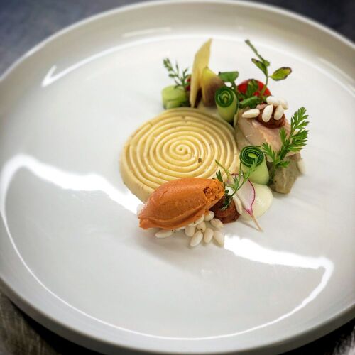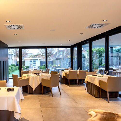 A mother and son team (Els and Sam) welcome guests into the stylishly elegant Van Landeghem family establishment. Floor to ceiling windows lead into the garden which is flanked by a patio. Dad, Luc, can be found rustling up tasty, flavourful delicacies in the kitchen, combining classical training and creative touches, ranging from Rossini tournedos steak to a bouillabaisse jazzed up with subtle, Asian notes.
