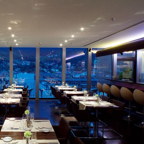 The location of this restaurant is not only spectacular, but also handy for doing a spot of shopping in the RathausGalerien mall before taking the lift up to the seventh floor for dinner. Here on the top floor, the upscale restaurant has all-round windows and a magnificent view of Innsbruck and the surrounding mountains – in summer, the charm of the terrace is irresistible! In the 360° bar you can drink in the marvellous panoramic view as you enjoy an aperitif, nightcap or coffee. The kitchen serves delicious international and regional dishes. In the evening there are three set menus comprising three to four courses; at lunchtime the à la carte selection is somewhat simpler.
