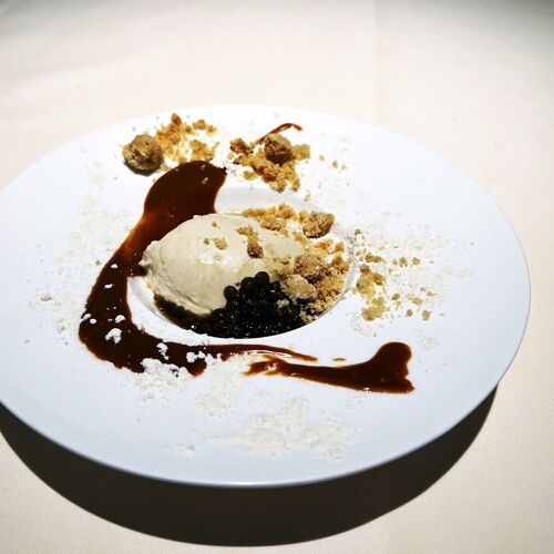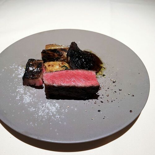 In this white-walled detached house facing Komazawa-Koen Avenue, with its cosy, wood-lined interior, sounds of food preparation from the open kitchen, and the atmosphere of a shop run by a couple, guests feel invited into a home. Chef Naofumi Takahashi specializes in meat dishes, such as bruschetta with home-cured ham and simmered tripe. He takes special pride in his slow-aged, char-grilled meats. Beef, aged to enhance umami, is seasoned with salt and pepper.