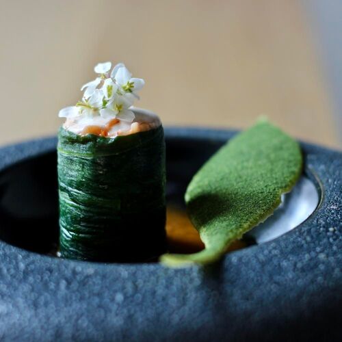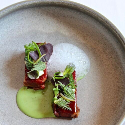 The surprise menu, designed to minimise waste, highlights local produce and adds an international twist with ingredients such as koji and miso. This cuisine is vibrant and exciting. They infuse a variety of pak choi creations, such as a leaf coulis and a stem slushy, with the subtle spiciness of tandoori and the floral complexity of different blooms. The chefs meticulously craft their dishes and regularly amaze diners with their sauces – the depth of flavour of the red wine and cardamom-based sauce they serve with venison is a case in point. The food at Lutum packs a punch!