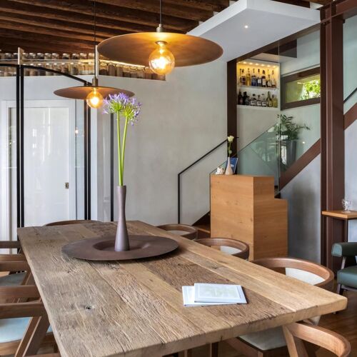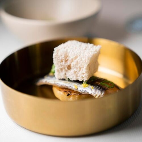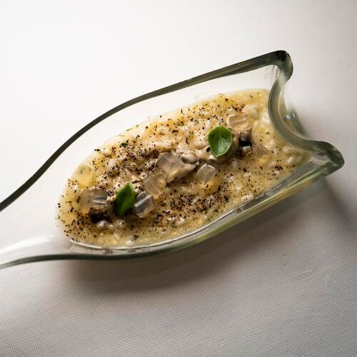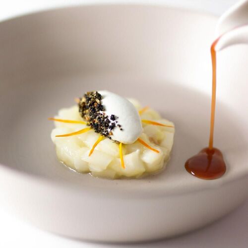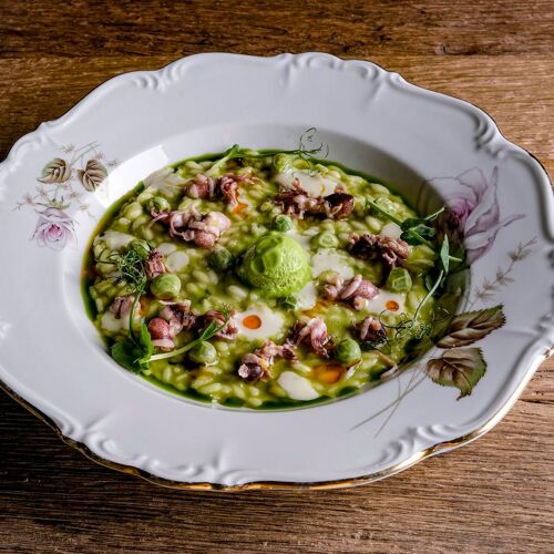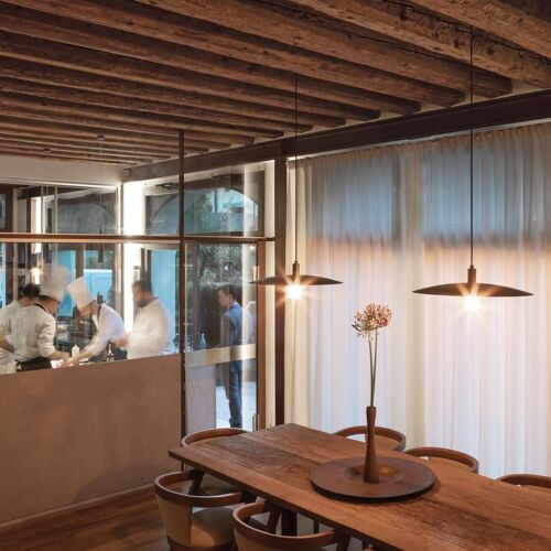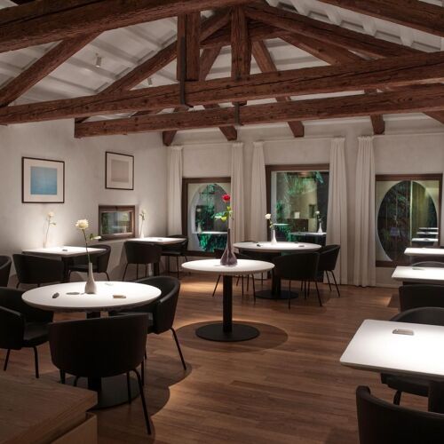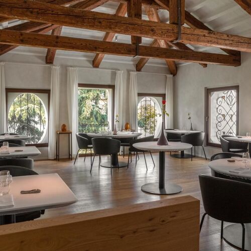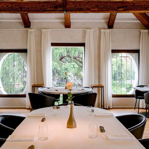 Situated in the historic centre of Castelfranco Veneto, this restaurant has an intimate, elegant and contemporary-cum-minimalist feel despite its period courtyard setting and original wooden beams in the first-floor dining room. Nicola Dinato’s cuisine is showcased on two tasting menus, namely Anima and Corpo. The former offers a selection of new dishes created by the chef, who is constantly updating his cuisine, while the latter features his historic signature specialities (don’t miss the scampi “busara” risotto). A lighter, less expensive menu is also available at lunchtime. The wine list includes an interesting selection of French labels, as well as some superb Italian wines, such as the 1999 Case Basse Soldera Brunello di Montalcino.
