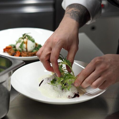 The wonderful painted ceiling – the work of artist Otto Zitko – is the first thing to catch your eye here. The staff are friendly and attentive, and the food is delicious. Among the Austrian classics on the menu is Wiener schnitzel with potato salad and lingonberries. For dessert, try the île flottante! In front of the building there is a lovely terrace shielded from the street by greenery. The location in the Karmeliterviertel is another draw – just a stone's throw from Schloss Augarten with its porcelain manufactory and museum, as well as its park grounds.