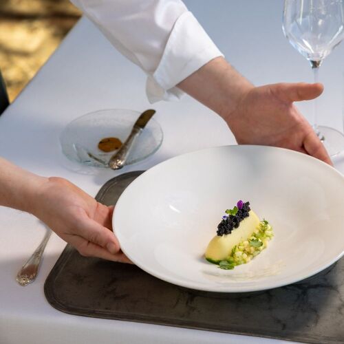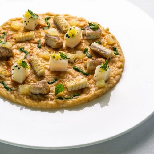 Location da favola, per una struttura che sembra un castello, ma che di fatto nacque come dogana sul Po nel XIV secolo. Se gli avi di famiglia erano mezzadri dell'azienda agricola circostante, Massimo Spigaroli è oggi proprietario di tutto (camere, bistrot Hosteria del Maiale, spazi comuni dedicati ad eventi/business), proponendo quindi un'experience a 360°, con l'imperdibile visita al Museo del Culatello e, soprattutto, con la sua cucina "gastrofluviale" che trae origine dalle tradizioni locali. Noi ci siamo deliziati con i ravioletti di gallina fidentina cotti in vescica (tecnica francese), nonché il porcelletto da latte di razza Nero Spigaroli con la sua cotenna croccante, gamberi e germogli.