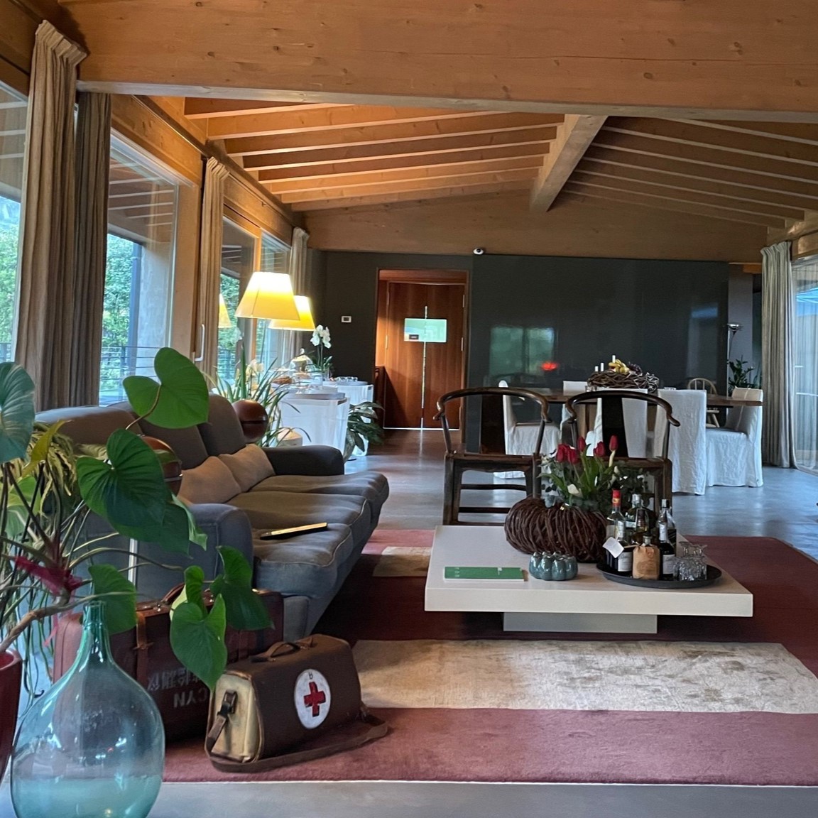 Difficile immaginarlo oggi, ma l’edificio ospitava un tempo un’azienda vinicola: ancora oggi vengono serviti i vini provenienti dalle vigne che circondano la proprietà. Il lago è facilmente raggiungibile a piedi, e sullo sfondo si staglia la maestosità delle Alpi.