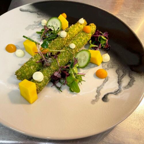 This restaurant is located in the Elberfeld district in a narrow street full of eateries, bars and small shops. With its unpretentious, trendy decor, the friendly and laid-back service, as well as its ambitious cuisine, this place is a hit! The dishes are modern and seasonal, drawing on Mediterranean and classical influences, from pickled Arctic char, elderflower tomato stock and tarragon oil to wild mushrooms, mashed potatoes, chives and nut butter foam. You have the option to create your own set menu – conventional or vegetarian. Lovely courtyard.