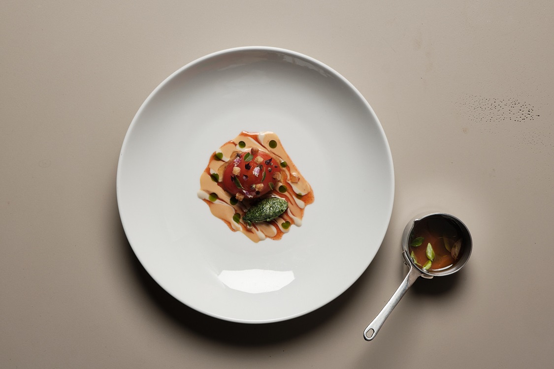 Facciamo un esempio per capire meglio il concetto. "Uno dei miei piatti più rappresentativi era Omaggio a Pomod'oro, che univa vari tipi di pomodoro in forma sferica coperti da foglia d'oro. Poi mi sono reso conto che avendo nell'orto 128 varietà di pomodori, non era necessario "lavorarli" troppo. Mi è venuto il desiderio di riprodurre nel piatto quelle "bistecche di pomodoro" che sapevano di sole, che mangiavo da bambino nell'orto con mio papà. Oggi taglio il pomodoro a fette, lo faccio asciugare in forno e lo sublimo con un'acqua di pomodoro in accompagnamento fatta con le 128 varietà di pomodori del mio orto. Il piatto è composto da un'insalata di pomodori crudi, olio di foglie di pomodoro, circa venti varietà di basilico. Si accompagna a una zuppa andalusa, il salmorejo di solito servita con uova sode e jamón ibérico, che io sostituisco con Prosciutto crudo di Cuneo su cracker di pane laccato con pomodoro e basilico. Quest'anno, col piatto, porteremo un foglio che racconta la storia del piatto, fatto con gli scarti del pomodoro, per una sostenibilità totale".