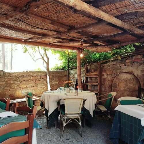 Nel cuore di San Quirico, una tipica trattoria ricca d'atmosfera e di ricordi, con una graziosa corte interna e porticati dove cenare appena il tempo lo consente. Cucina tradizionale e toscana.