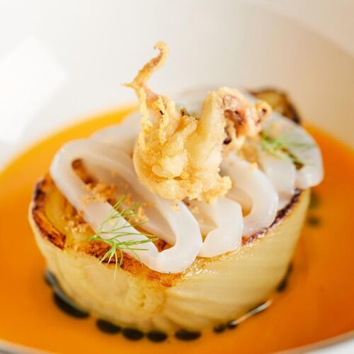 Once over the threshold, a fascinating experience awaits at Cocina Hermanos Torres – one that transports guests to a world where time has stood still thanks to the magical setting and highly delicate Mediterranean cuisine that takes us away from our everyday lives. The Torres twins (Sergio and Javier) dreamt of incorporating their culinary microcosmos into the heart of the dining room, transforming the culinary experience into a true spectacle, hence the three cooking stations that dominate the centre of the room, around which tables are arranged beneath romantic “clouds” of light. The cuisine here is centred on a superb menu that invites guests on a gourmet journey extolling the very best seasonal and local ingredients, using them in such a way to extract maximum impact and flavour with a minimum of intervention. This includes standout dishes such as the cured squid with poultry consommé and caviar – a spectacular “sea and mountains” combination. The magnificent wine cellar here is overseen by no fewer than five sommeliers! If you wish to book a table for one you’ll need to contact the restaurant ahead of time.