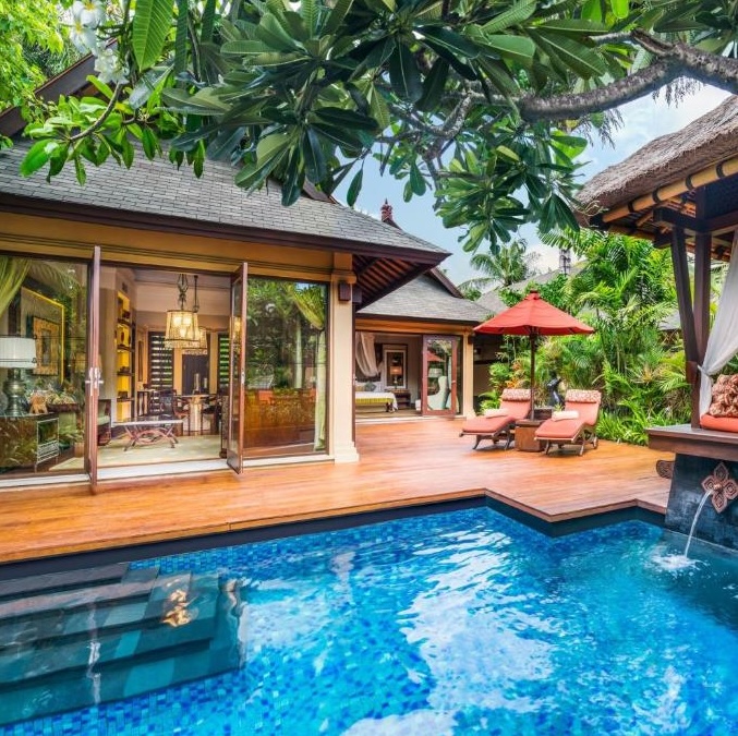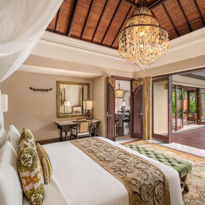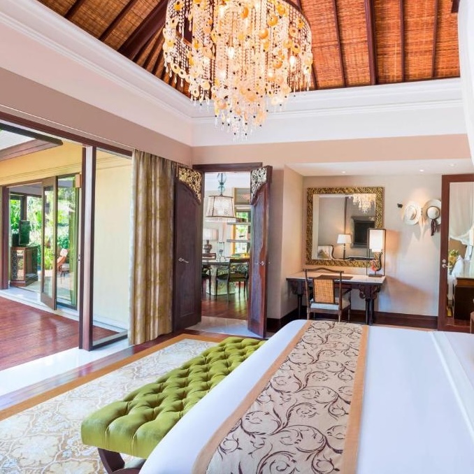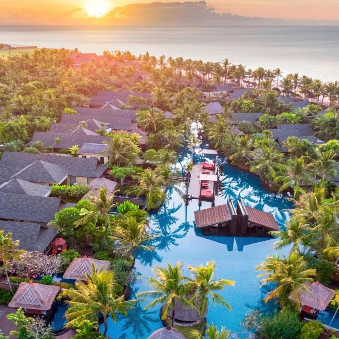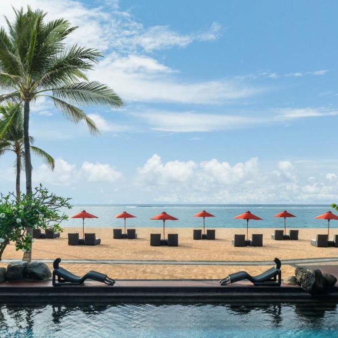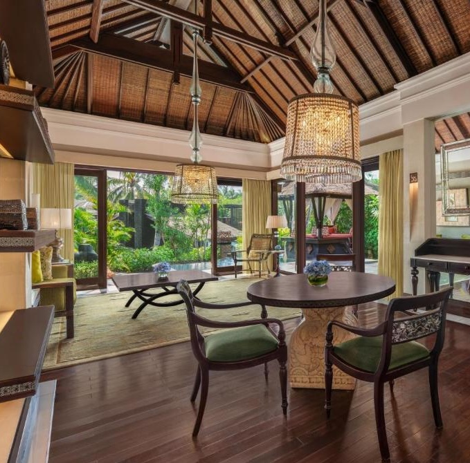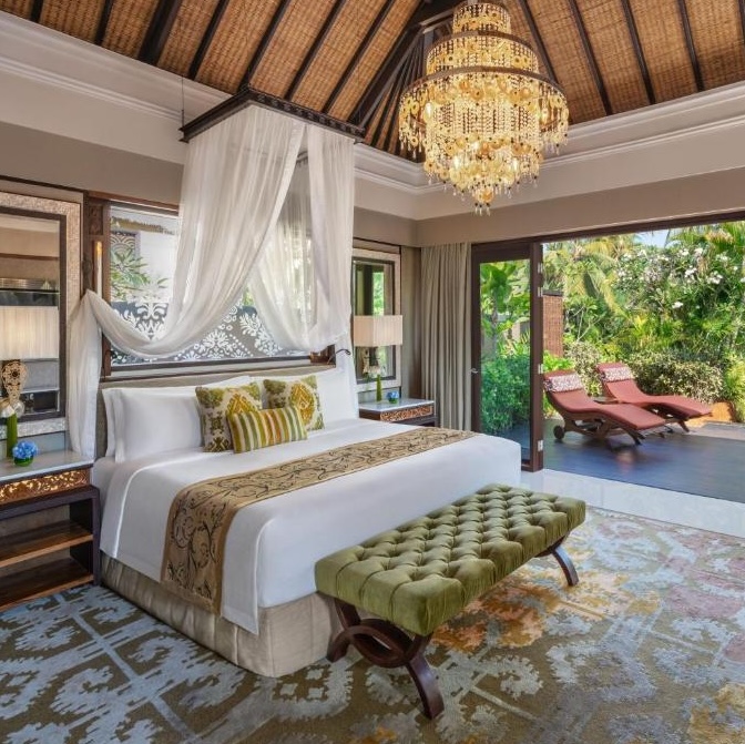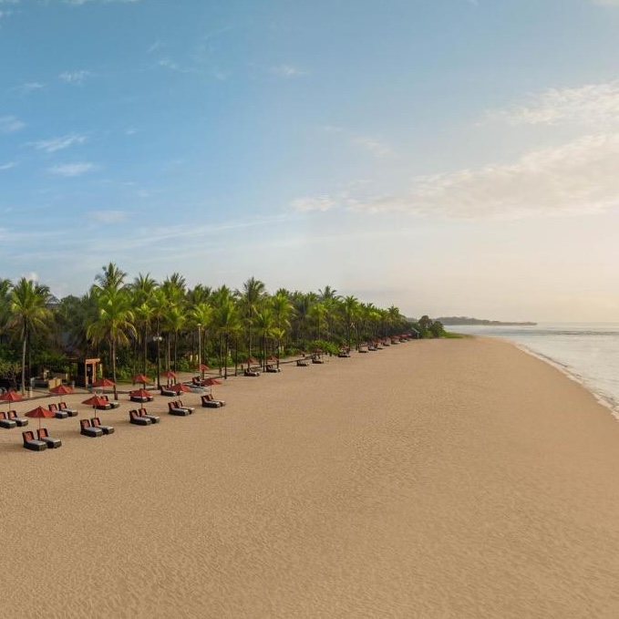 Nusa Dua has no shortage of pristine beaches to choose from, but The St. Regis Bali has taken a particularly idyllic stretch of sand right on Nusa Dua beach, overlooking the calm waters that make it an ideal spot for swimming and sunbathing. The collection of suites—there are no mere guest rooms here—are some of the largest on the island and come with guaranteed garden, pool or ocean views and the signature St. Regis 24-hour butler service. Check in to the top of the range one-, two- and four-bedroom villas for extras such as private pools and direct access to the saltwater lagoon or beach. There is also a kid’s pool and a heated pool at the spa, which offers treatments based around traditional Balinese therapies. Dining options include traditional Balinese cuisine at Dulang, pan-Asian dining at the oceanfront Kayuputi, and cocktails and jazz at The St. Regis Bar.