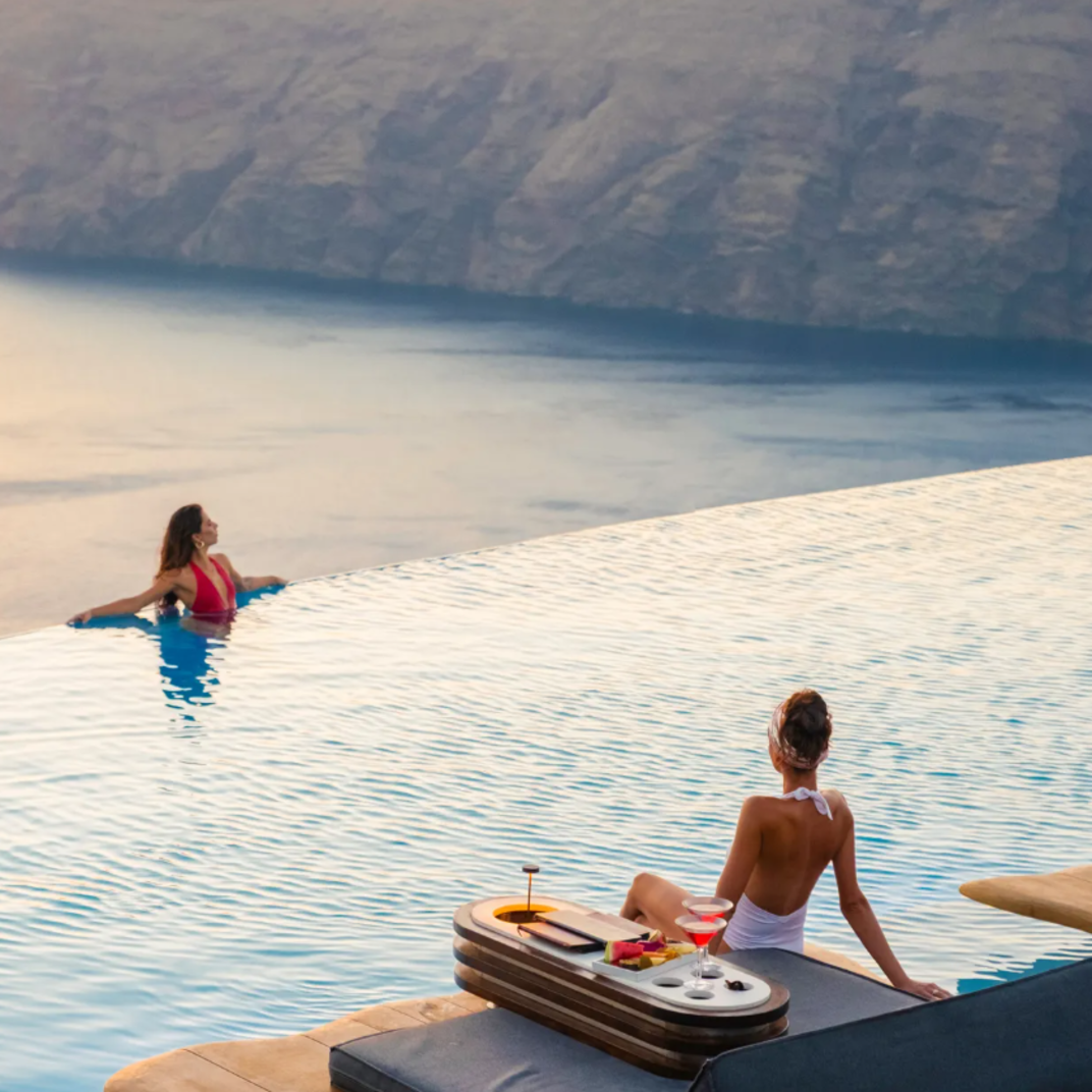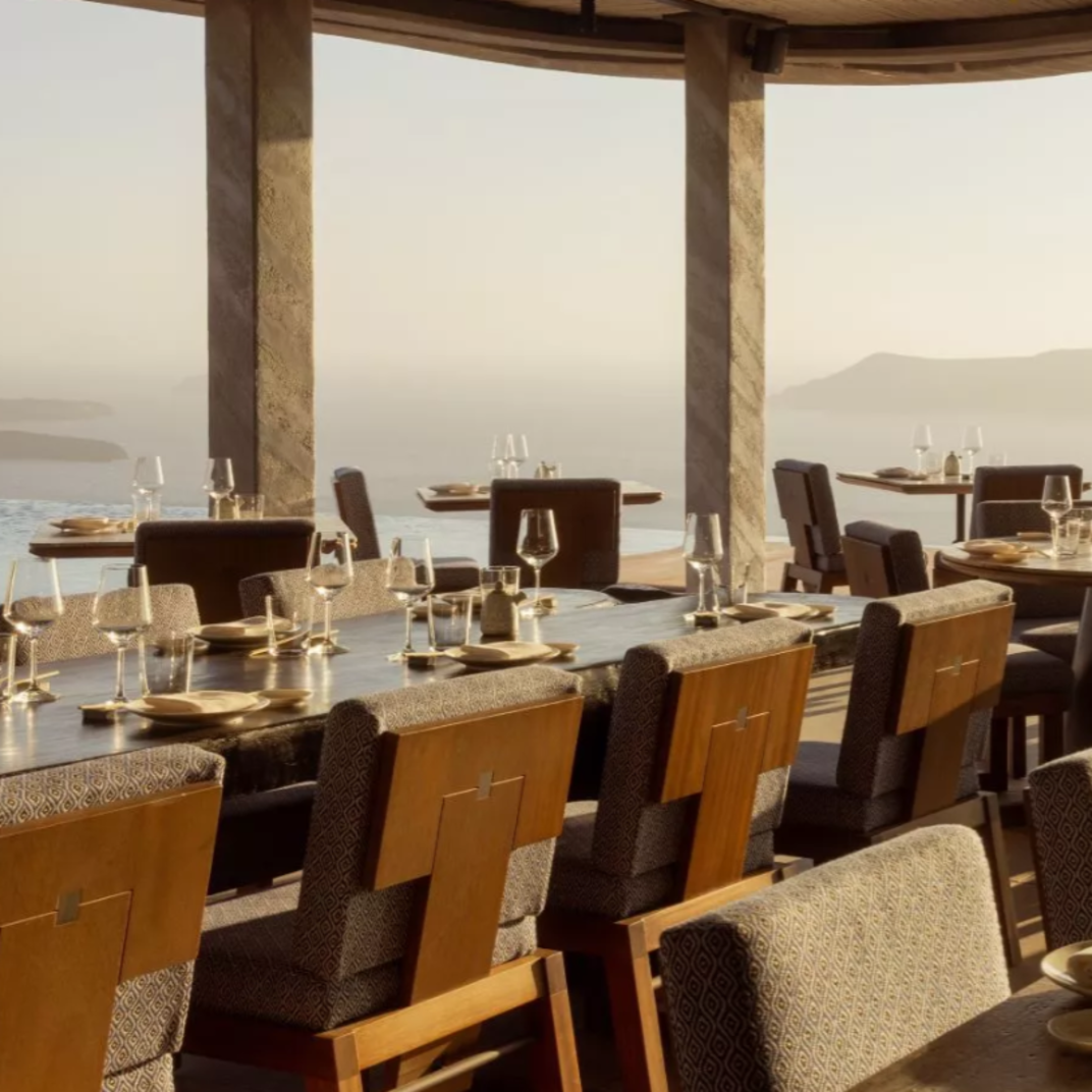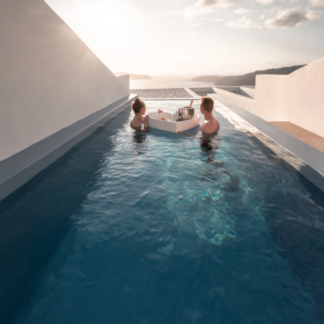 Cavo Tagoo, like most of the best hotels on Santorini, isn’t just a casual B&B at the beach. It’s a stunner of a resort, complete with dramatic whitewashed architecture, five-star amenities, a seductive open-air bar and restaurant that’s a destination in itself. The owners know what they’re doing. The flagship location of the Cavo Tagoo, just a hop, skip, and a jump away on the island chain, is considered one of the best hotels on Mykonos. They have a formula that works — Cycladic minimalism, to borrow their phrase, a killer cliffside location, an air of exclusivity, a preternaturally hip and youthful staff — and they’ve repeated it here.