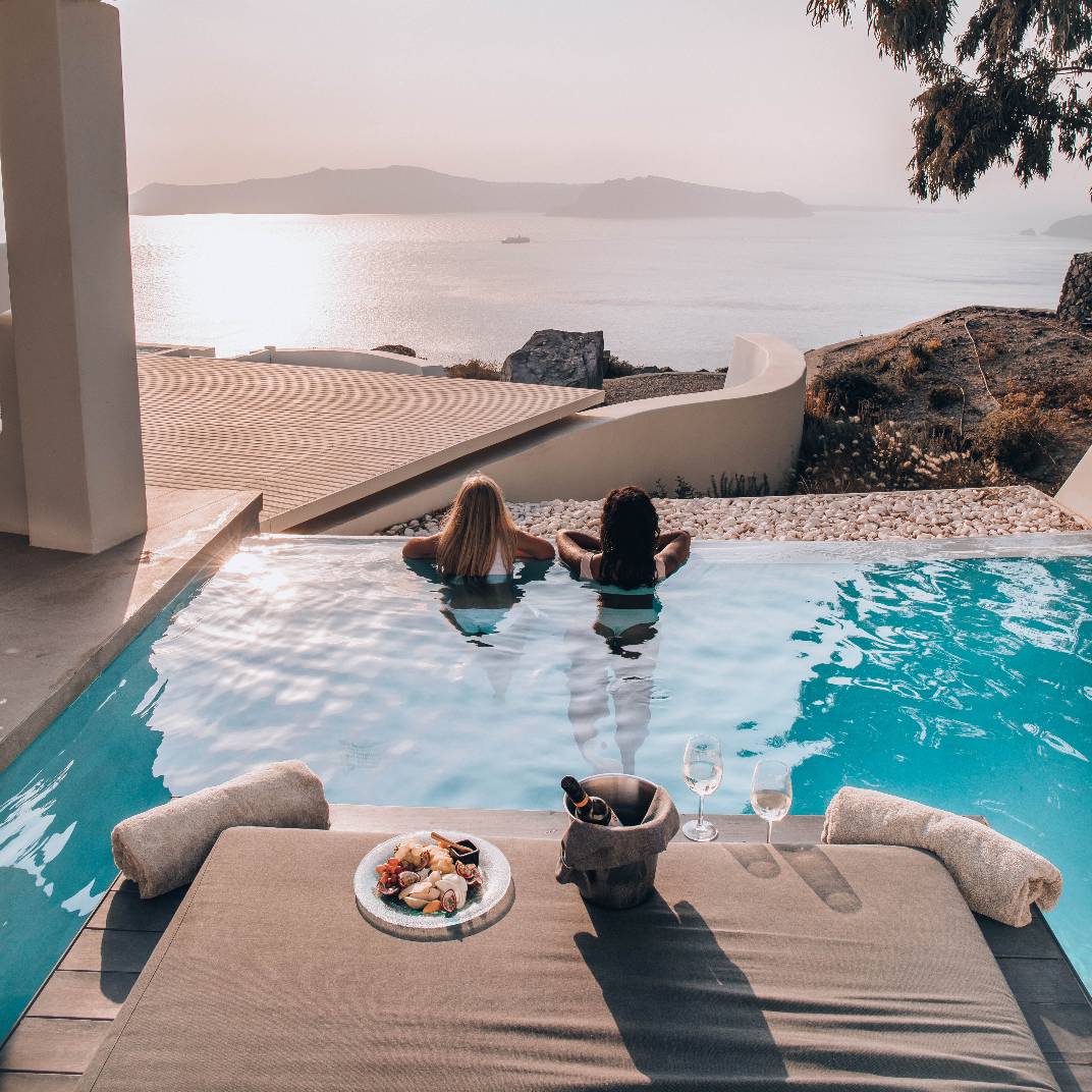Cavo Tagoo Santorini doesn’t have any standard guest rooms, only suites. And those suites deliver the wow factor. Even the most basic option is sleek and spacious, bathed in natural light and featuring a Jacuzzi and a private balcony or terrace. Note the French doors, the copper sink, the potted plants — there’s beauty in the details, which double as welcome reminders that you’re on a Mediterranean island, not somewhere in the Caribbean. Standard amenities include 43-inch flat-screen TVs and free wi-fi. Moving up the scale, the suites get downright lavish, with wide terraces and private plunge pools. The views over the caldera are equally enchanting from Ovac, the hotel’s signature restaurant, or from the daybeds at the open-all-day pool bar and lounge. You could see the sunset from anywhere on the island. But it looks even better from here.