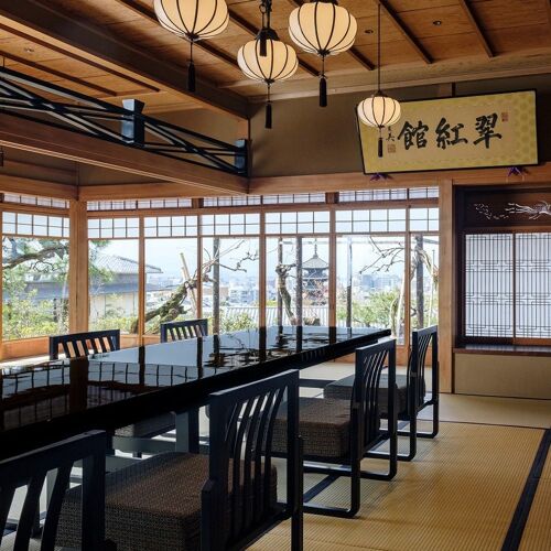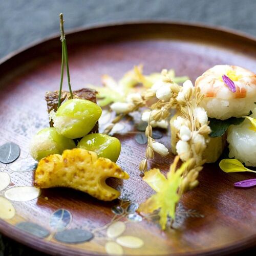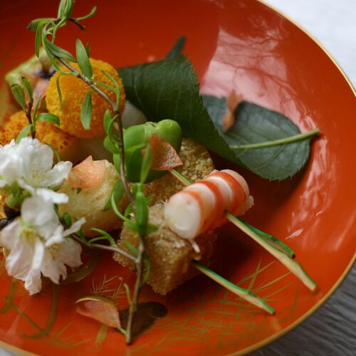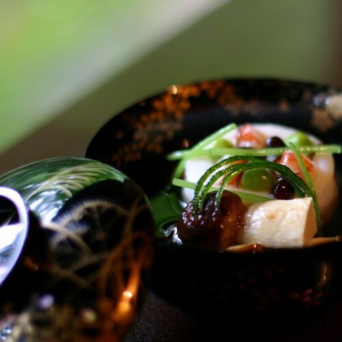 During the short walk from the front gate to the main buildings, guests can appreciate the history of the buildings while feeling the presence of nature. Classic aesthetics pervade the entire site, from the sukiya design of the buildings to the space reflecting seasonal ceremonies and views of the garden. The chef wants every aspect of Sanso Kyoyamato to be beautiful, so he takes special care with the refinement of his food arrangements and their elegant flavours. The painstaking service of the proprietress and hostess is an agreeable presence. Diners will sense a complete work of Japanese art.