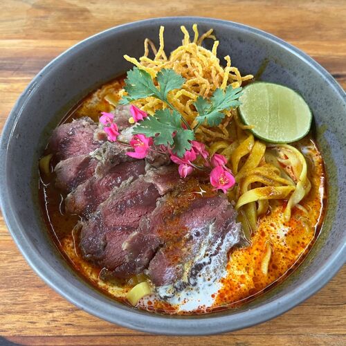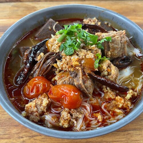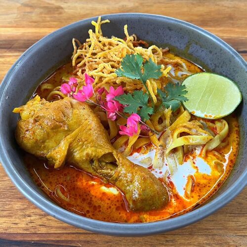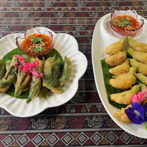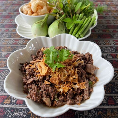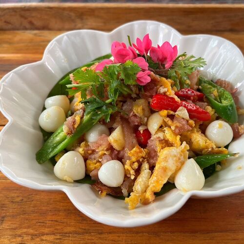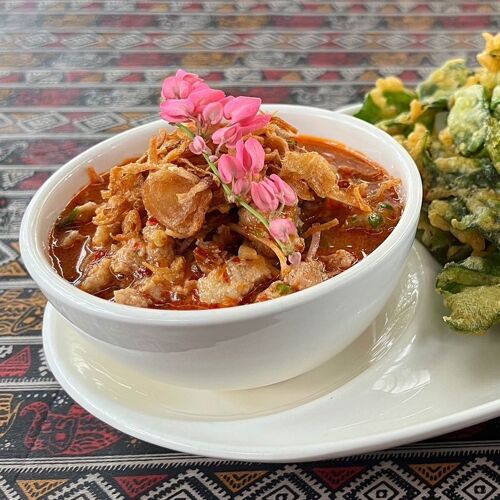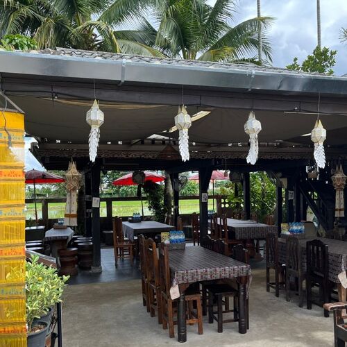 Food and atmosphere are well-matched at this chill Northern Thai restaurant in Mae Rim. It’s in a two-storey wooden pavilion with regular tables downstairs and cushioned floor seating upstairs; both options offer relaxing rice field views and refreshing breezes. The food here is equally fresh, as well as flavourful and easy on the wallet; the Northern Thai spicy pork salad and the Northern Thai hot and spicy soup with fish and morning glory are recommended.