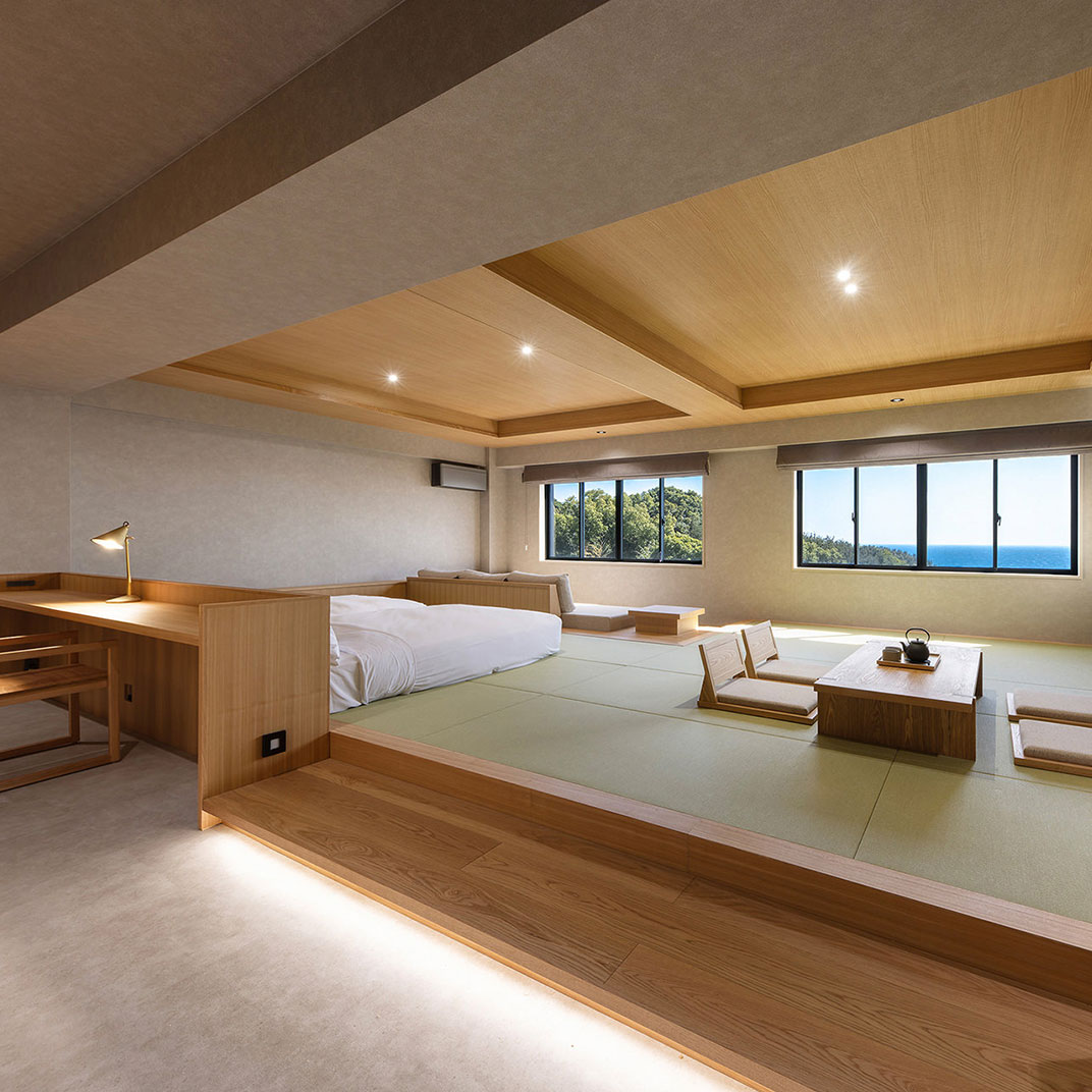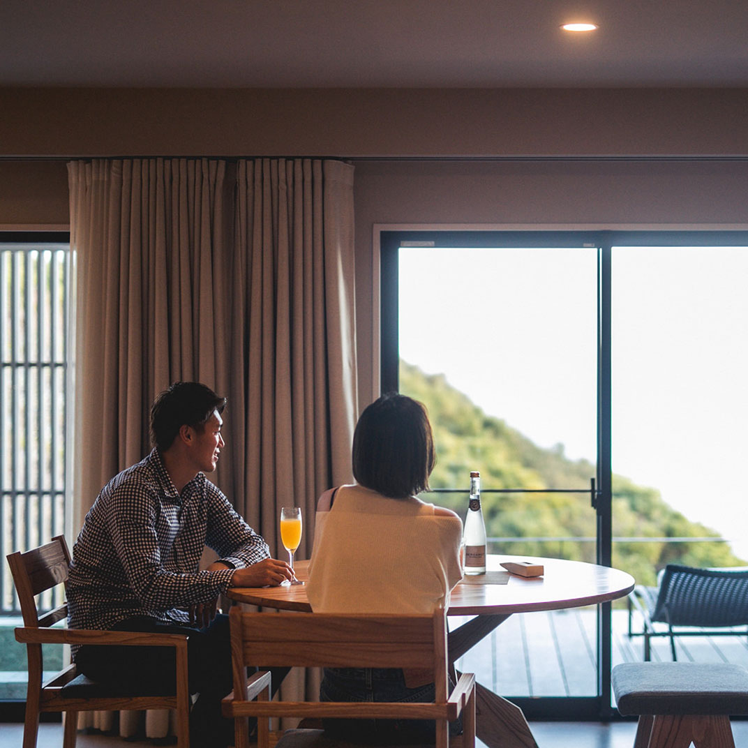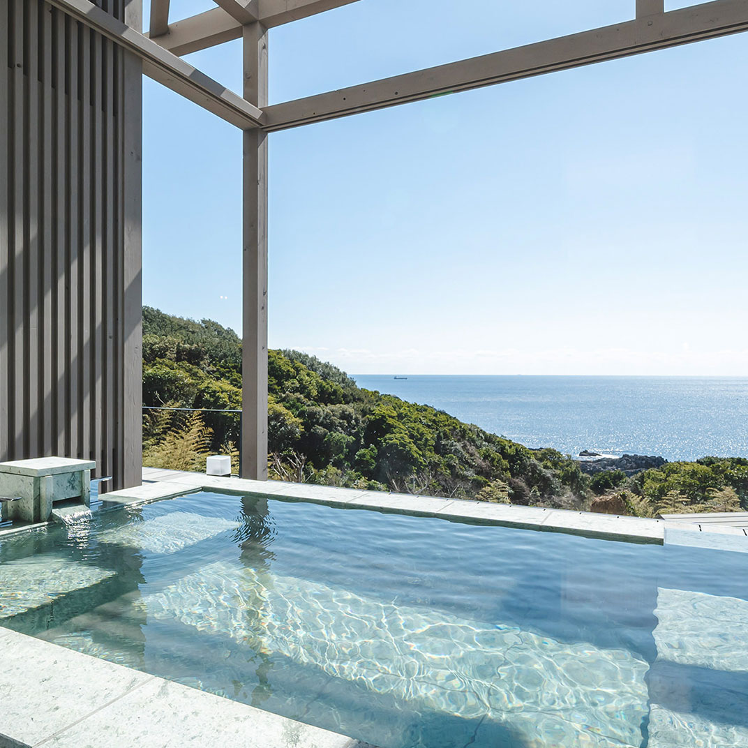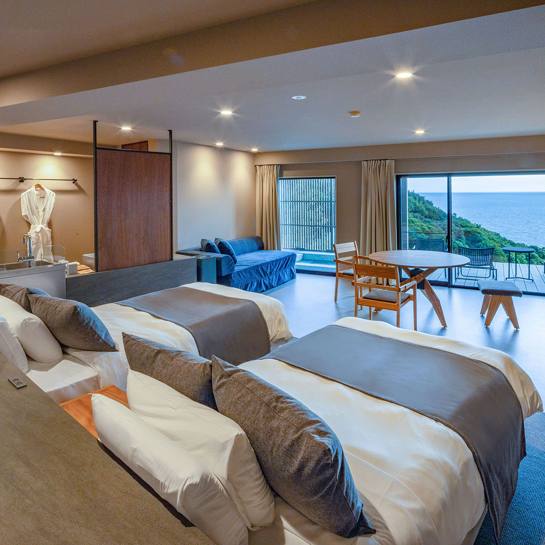 Cape Ashizuri, the southernmost point of Shikoku Island, is widely admired for its picturesque landscapes and seascapes. And it’s here, within Ashizuri-Uwakai National Park, a short distance from the cape’s lighthouse, that you’ll find TheMana Village, a small but spectacular lodging that derives much of its drama from its singular natural environment. Four minimalist-luxe rooms and suites make up the accommodations, and just like the public spaces, all of them are oriented to take in hypnotic views of the sea. And it’s the Pacific itself that inspires Azzurrissimo, the hotel’s high-end Italian restaurant.