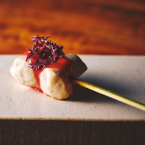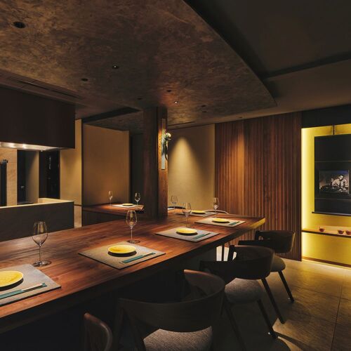 オープンキッチン中央の炭台と薪窯が目を引く。料理長は炭火と薪火を駆使した焼鳥に腕を振るう。京都産の地鶏と鴨を主に扱い、炎を操り燻香をまとわせる。様々な部位を炭火で串焼する傍ら、かたまり肉を薪火でじっくり焼く。締めは鶏だしを用いたラーメンやカレーなど。鶏を余すことなく味わえる。