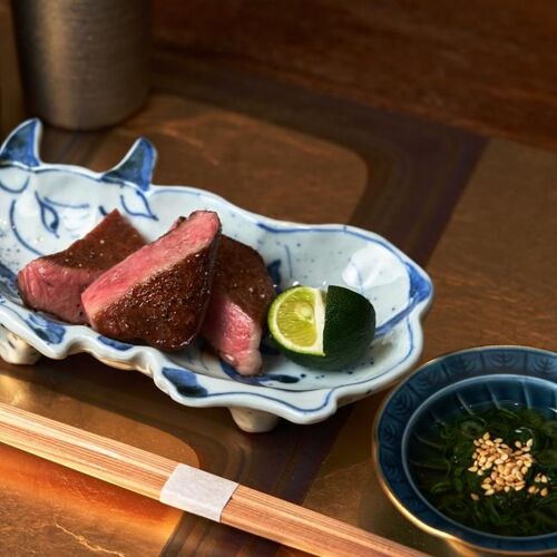 型にとらわれない自由な日本料理。料理長は印象に残る料理を念頭に、旨みを重ねた味の足し算で創作する。造りはおろし玉葱や土佐酢ジュレを合わす。焼物の煎り酒は煮干しを加えてふくよかに。献立は椀物や八寸を置かず、和牛料理を盛り込む。だし酢で味わう牛タン、食パンを巻いて揚げるカツが自信作。