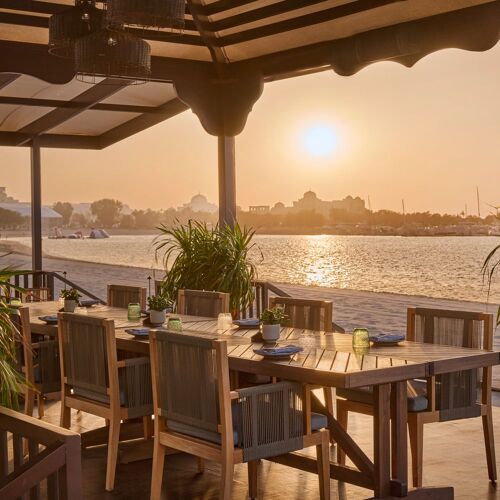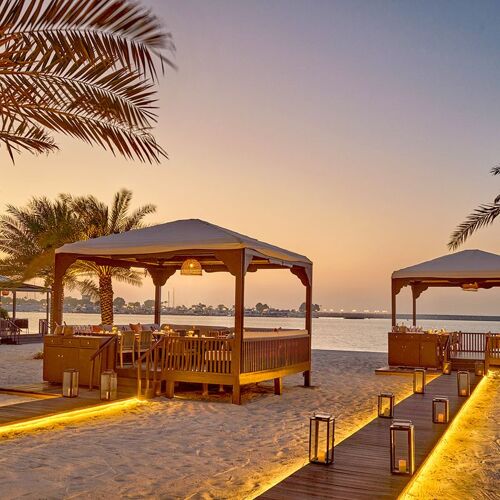 It’s not every day that you get to sit in a luxurious beachside gazebo overlooking a grand Presidential Palace and a glistening Arabian Gulf, but this is exactly the appeal of this modern restaurant. Catch the sunset with a drink before enjoying tasty woodfire cooking. Take your pick of mouthwatering steaks, ‘Reef and Beef’ – their version of a surf and turf – or seafood platters if you plan to share. Finish off with a smoked chocolate mousse or fig tart. This is where to come for a romantic evening out.