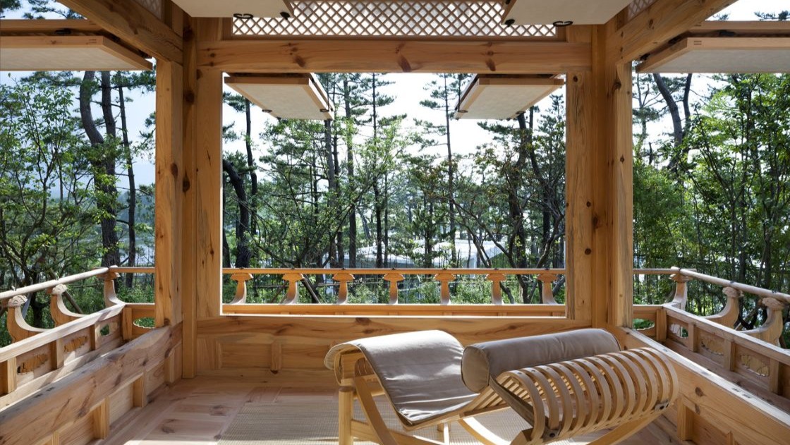 Hero image: A serene forest view unfolds from the 'anchae' building of Hoanjae, SEAMARQ’s traditional hanok annex. ©SEAMARQ Hotel