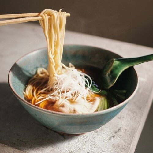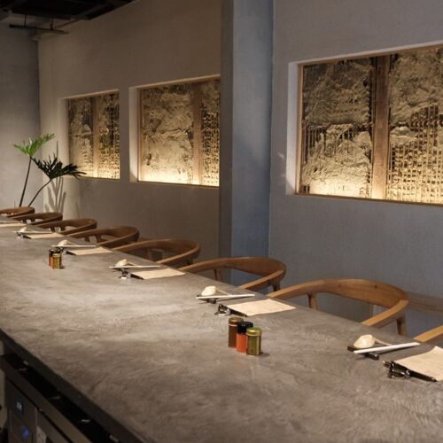The residential neighbourhood is a maze and there’s no sign for the restaurant. A spotlight on a bowl of ramen in a showcase indicates you’ve arrived. The industrial space has the feel of a laboratory. ‘Raamen’ is a blend of Kyoto wheat noodles in a clear soup of seafood dashi stock. Thinly sliced roasted pork fillet is from Kyoto-raised swine. Blue bowls of specially ordered Kiyomizu ware set off each meal to its advantage. Custard pudding, sweetened with refined sugar, is a popular item.