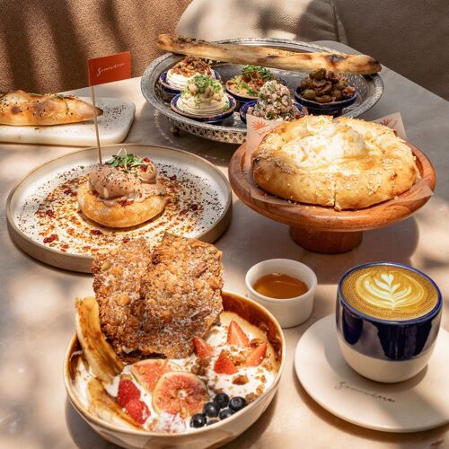 You’ll find this eatery located on the edge of AlUla’s largest palm grove, a short walk away from the Old Town. The restaurant blends contemporary and traditional Mediterranean design, with its comfortable cushions, wrought iron furniture, piles of fresh fruits dotted around and dune frescoes on the walls. The main attraction is the wooden terrace that overlooks AlUla oasis. Middle Eastern classics, mostly from Egypt and Lebanon, boast some creative twists with occasional hints of fusion, resulting in dishes that are colourful, generous and packed with flavour. Favourites include shawarma-filled bao and the family favourite Omm Ali made of croissant and oat milk.