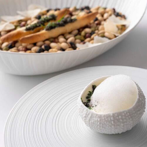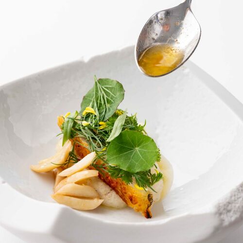 The pet theory here is that French cuisine does not add but multiplies: dishes are the product, not the sum, of their ingredients. The speciality is an espuma of sea urchin and Jerusalem artichoke, which is replaced with onion during summer. Food from sea and mountain mix, aiming at just the right temperature to melt in the mouth. To ensure consistency, vegetables are harvested from the chef’s own garden. Financier, served after the meal, offers a wry nod to the restaurant’s name, with a play on both the pastry and the financier as one who benefits from gold, echoing the alchemist’s quest to transform base metal into treasure.