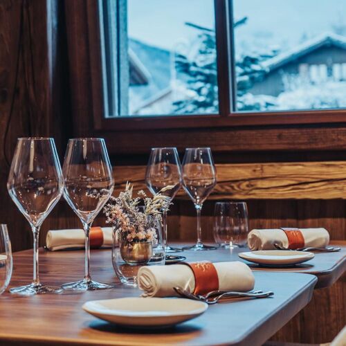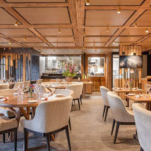 In the heart of a genuine Alpine village dominated by the Miage peaks, a former bakery has morphed into an understated luxe chalet that is home to a swish, sleek mountain restaurant decked out in wood, stone and velvet with an open kitchen. A plush, muted vibe, cosy bar, glazed cellars, a tearoom and dining for forty. The chef celebrates local produce – fish from Lake Geneva, Douvaine duck, in a single set menu of seasonal inspiration. Spot-on, indulgent and consummately crafted cuisine. Just the ticket for high-flying gastronomy overlooking the “roof of Europe”. Alfresco dining with a view in summertime.