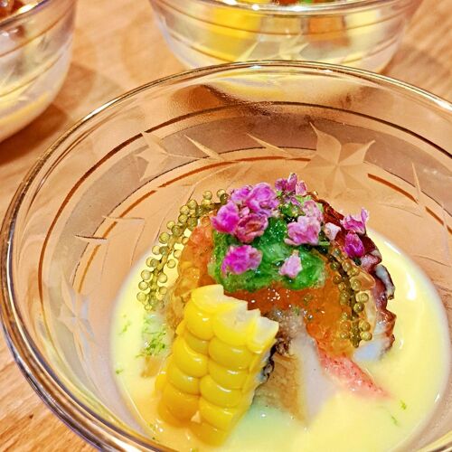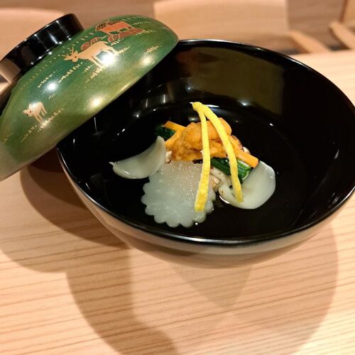 The restaurant’s name symbolises the spirit of Hiroyuki Ikejima: his gratitude to his mentor; the proprietress, his wife; and his parents. Every day, as he takes his place in the kitchen, he remembers to be thankful to those who supported him. Ikejima’s vegetable sculpture is a skill transmitted directly to him by his mentor. He places great importance on his soup stock, drawing the umami from a wide range of ingredients. His ankake (thick starchy sauce made from kudzu) of wagyu beef and vegetables is enlivened by stock made from both.
