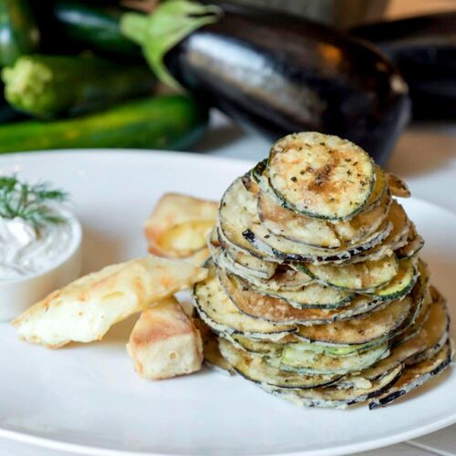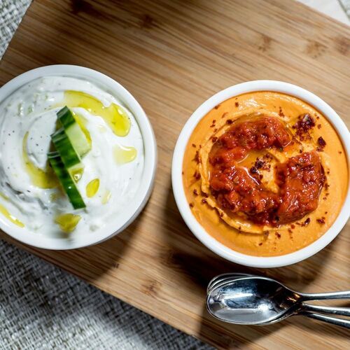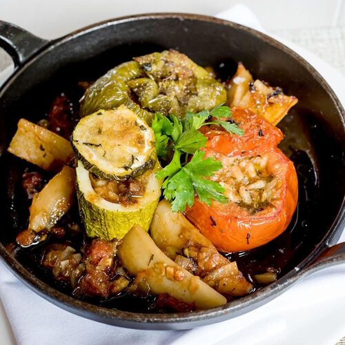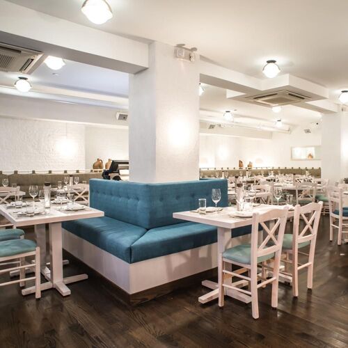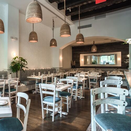 Fitted out with whitewashed brick walls, weathered wood beams, and pretty lighting, this bi-level space exudes all the modern Med feels. Add on the deliciously rustic food and you have a win. Imagine everything from creamy spreads with pita bread to fresh fish. Following suit, ingredients are given the spotlight in the likes of htipiti (feta with roasted chili pepper) as well as whole grilled tsipoura in a lemon, olive oil, and caper sauce. The stuffed tomato filled with arborio rice, golden raisins, pine nuts, and herbs is a savory delight, as is the elevated version of a classic moussaka. Finish with sokolatina, a scoop of Valrhona chocolate mousse topped with cherries and resting atop a chocolate cookie.