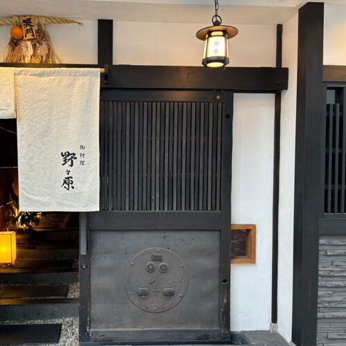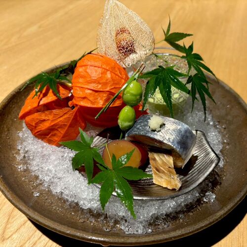 The restaurant weaves the culture and traditional ceremonies of Japan into its menu. In the seventh lunar month, to celebrate Tanabata, the Star Festival, wanmono is served in lacquer bowls featuring the Milky Way in powdered precious metal. Other tableware also reflects the seasons. One wanmono item features a pairing of hamo and samatsu mushroom in a dish that recalls the tale of Hikoboshi and Orihime: the stars Altair and Vega, two lovers destined to meet but once a year. Sweets include umegae mochi, from Dazaifu Tenmangu Shrine in Fukuoka. Tea from the Yame area of Fukuoka is served in homage to the chef’s hometown.