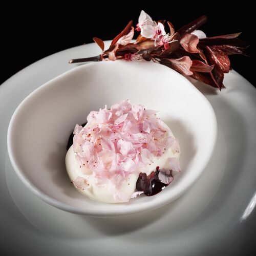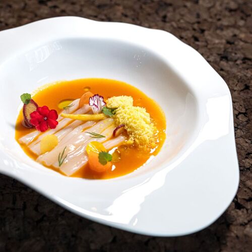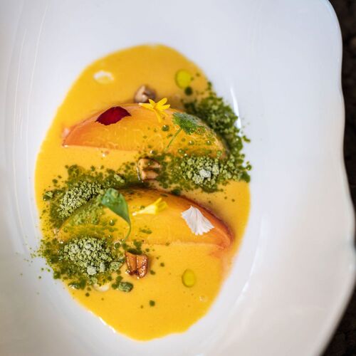 If you’re looking for a special restaurant, La Boscana offers a culinary experience enhanced by its natural setting, with glass-fronted buildings overlooking pretty gardens, leafy groves and an idyllic lake, making this one of the most romantic places to eat in Spain! In its elegant dining room, bathed in natural light and embellished with designer details, enjoy innovative cuisine from Joel Castañé that has a strong emphasis on detail, both in terms of technique and presentation. Through his menus (usually one concise menu and a second, more extensive, seasonal option), the chef skilfully reworks the flavours of Lérida as he searches for the perfect symbiosis between his savoury dishes and the fruits that enhance them, the latter sourced from various fruit farms in the local area as well as from his own garden. His delicious pork and apple tartlet pays homage to two of Lérida’s most iconic ingredients.
