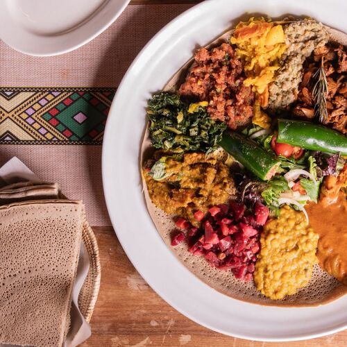Dynamic chef/co-owner Aida Taye offers a lighter, unique approach to Ethiopian cuisine, as in a kifto that substitutes lean tuna for beef. Kick off the meal with kategna, an injera toasted to a crisp, doused with chili powder and served with a sour-cream/yogurt dip. A vegetable platter includes gomen, or chopped collard greens; atakilt, a tender stew of cabbage, potatoes and carrots; fossolia, or green beans stewed with carrots, turmeric, tomato and onions; and azifa selat'a, refreshing green lentils tossed in lemon juice and hot mustard vinaigrette.
