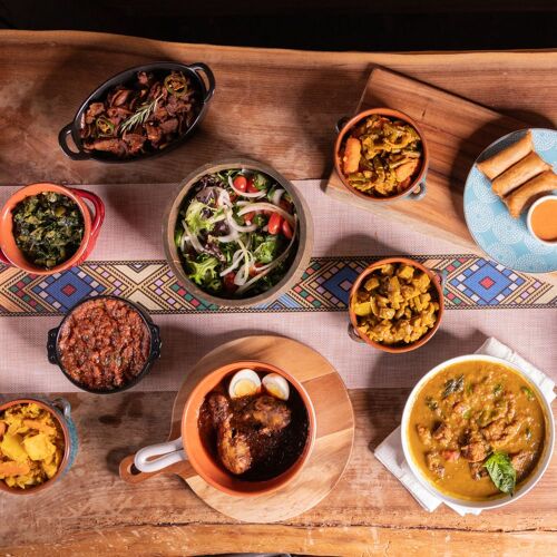 LeYou is an ode to contemporary Ethiopia, where the dining room is filled with tall, leafy greenery, tables are topped with burlap coffee bags tucked under thick glass, and artwork adorns the walls.