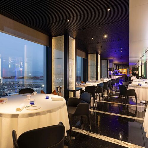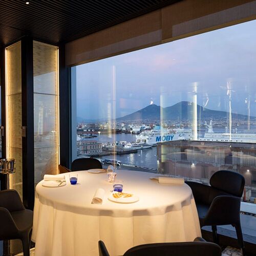 Alain Ducasse, one of the great names in contemporary fine dining, has arrived in Naples, opening this restaurant in the former premises of the prestigious Ristorante Il Comandante. Situated on the 9th floor of the ROMEO hotel overlooking the port, the restaurant boasts fine views of Vesuvius and the Bay of Naples, especially at sunset when the colours are truly spectacular. Meanwhile, the modern dining room, decorated completely in black, is equally as stunning as its surroundings, as are the finishing touches added to the dishes in the dining room by the excellent serving staff. Executive chef Alessandro Lucassino, who was born in 1991 and has years of experience working with his mentor, adds a personal flavour to local recipes from Campania: by using short cooking times, he preserves the nutritious qualities and flavours of local fish and vegetables (a few meat options also feature on the menu) while remaining faithful to Ducasse’s cuisine de la naturalité approach. The sauces and broths are textbook French, as is the chocolate soufflé.