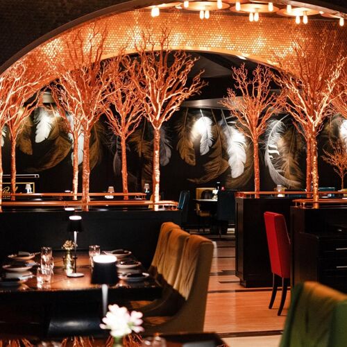 Un restaurant qui se distingue par ses arbres couleur or et ses deux grandes tables avec banquettes abritées sous une « bulle ». La carte indienne propose une cuisine de la rue variée et quelques plats inspirés par les saisons. Les recettes, préparées avec savoir-faire, sont légèrement épicées et parfois agrémentées de touches modernes. Ne manquez pas le momo au poulet aux oignons confits et à l'ail, et le dessert baptisé « aamsutra ». Séduisant menu le midi.