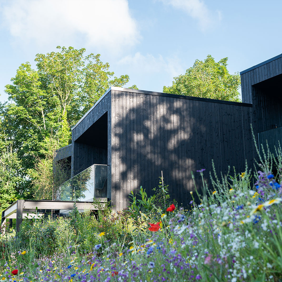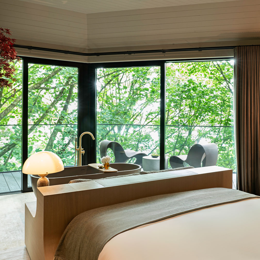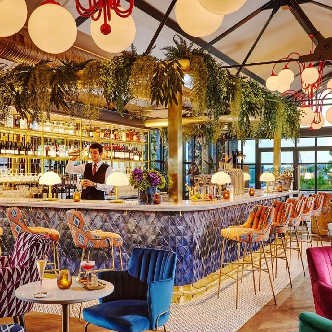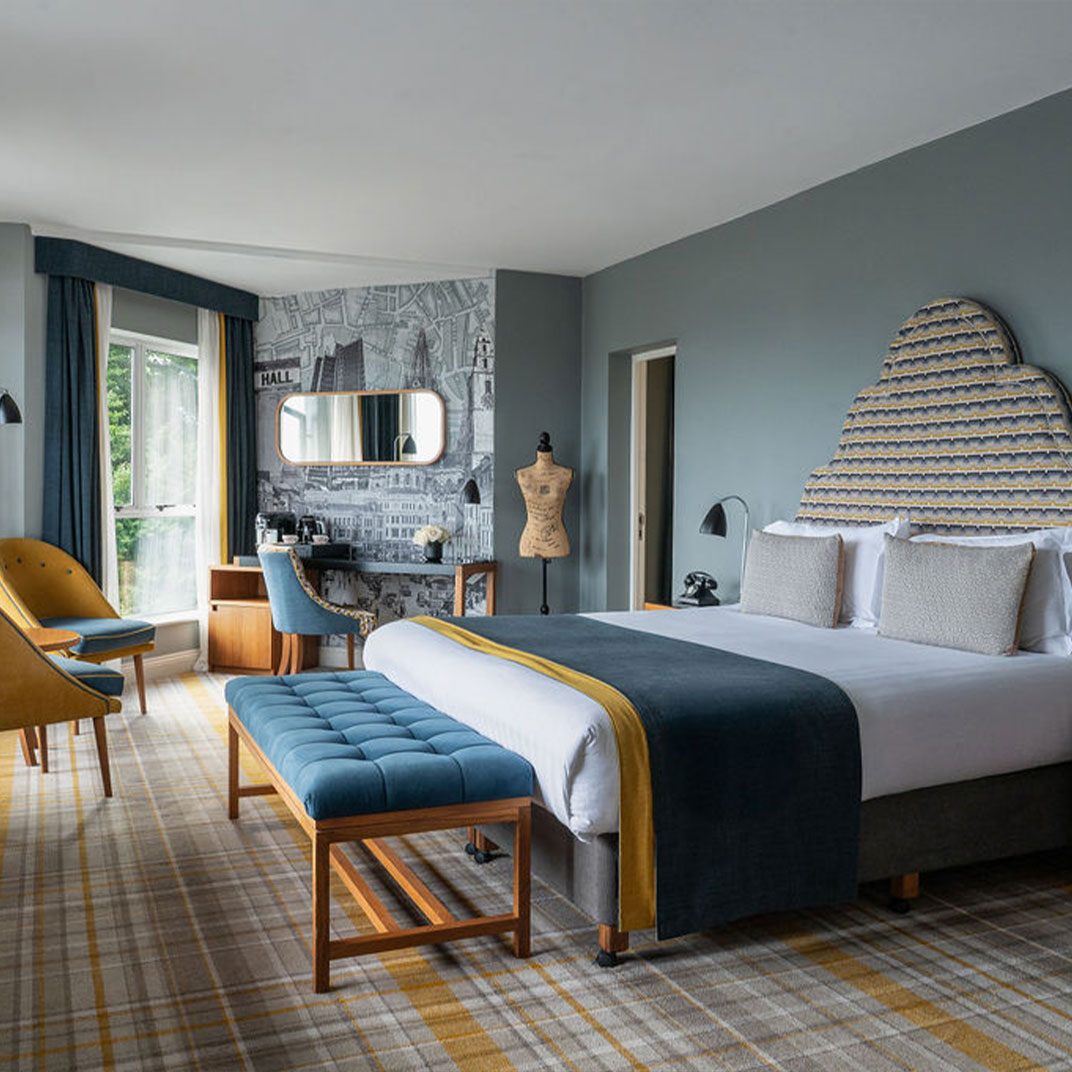La transformation s’illustre par un design contemporain, joyeux et éclectique, mais qui respecte l’identité de son écrin. Des couleurs pop et des motifs graphiques viennent réveiller les intérieurs de cette demeure historique, associés à un mobilier rafraichissant aux silhouettes classiques tapissées d’imprimés vibrants. Si les chambres ne sont pas gigantesques — il s’agit d’un manoir doublement centenaire, pas d’un centre commercial — elles ne lésinent pas sur le confort.