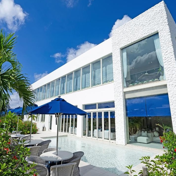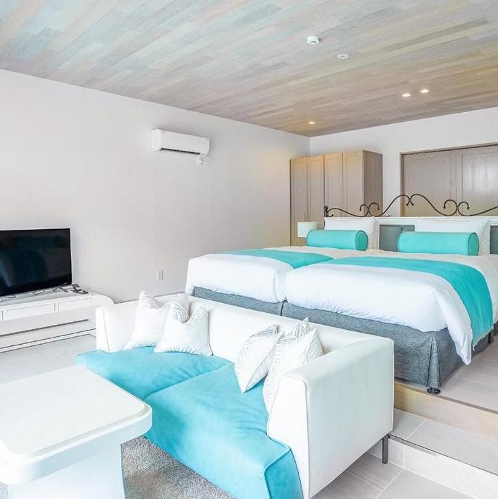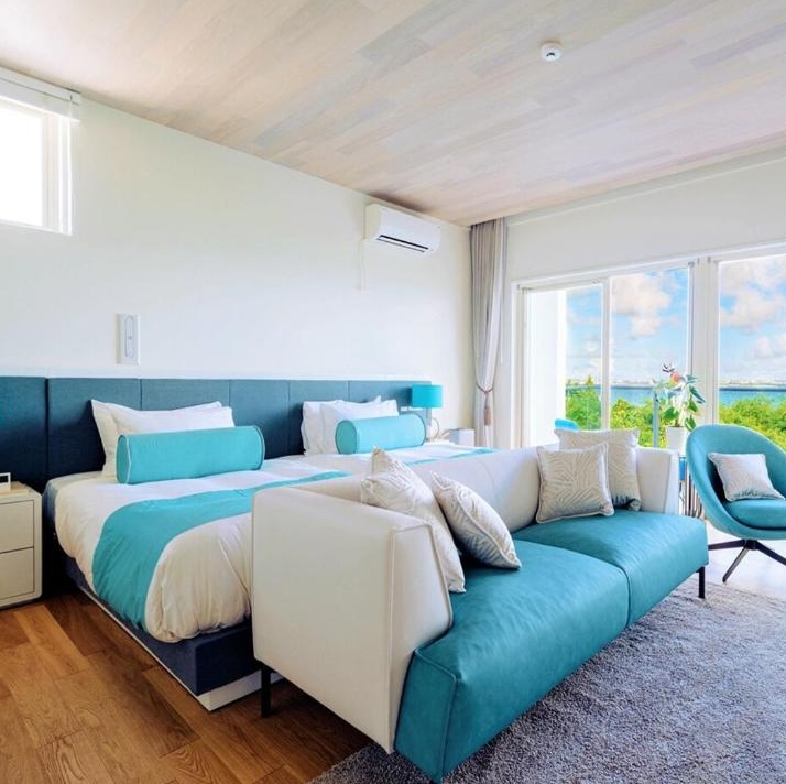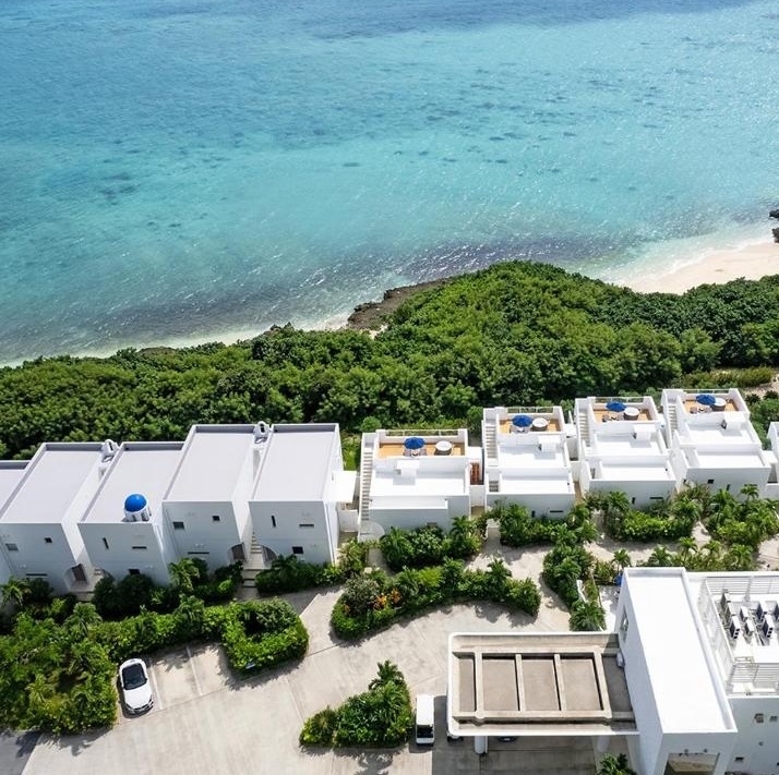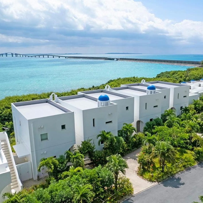 Blue Ocean Hotel & Resort sits at the entrance to Irabu Island, just across the bridge from Miyako Island's main airport. White-walled villa suites come with rooftop terraces, private pools, and jacuzzis: standard villas sleep three, while one premium villa claims 79 square meters in a secluded corner. Hotel-style suites split between upper-floor balconies facing the Irabu Bridge and ground-floor terraces surrounded by greenery. The Aegean Sea restaurant works with local producers, serving Miyako wagyu, Irabucha fish, and Gurukun alongside views of what locals call Miyako Blue, the region's famously crystalline water.