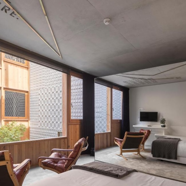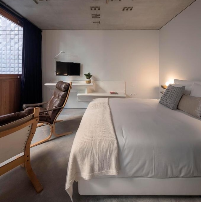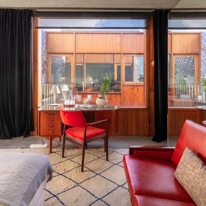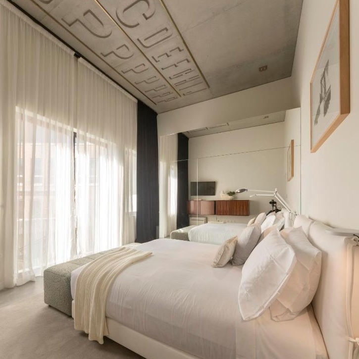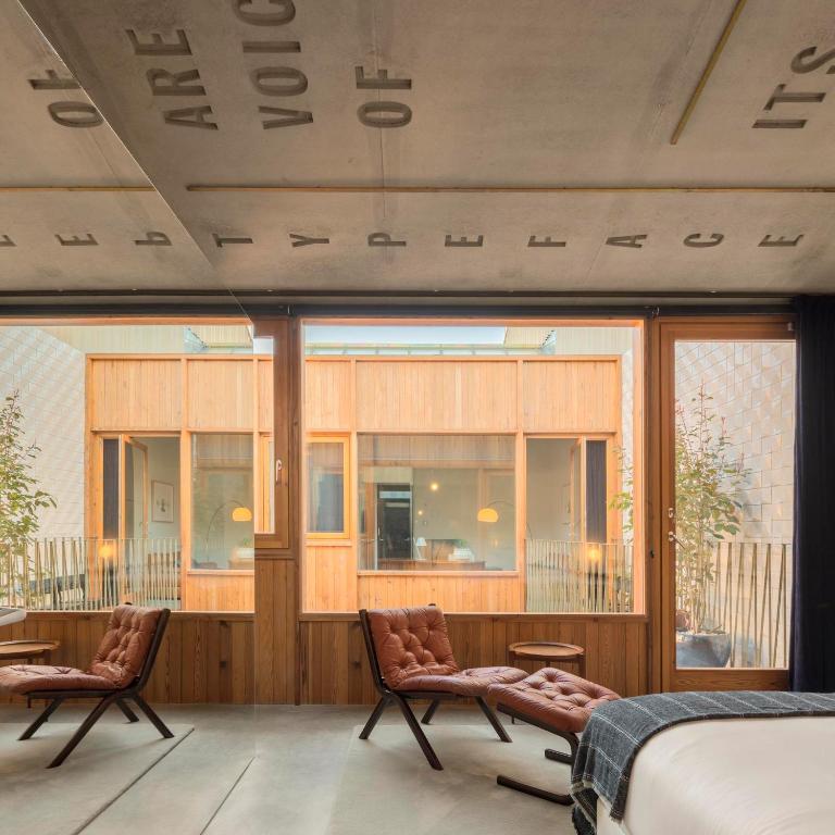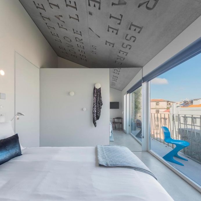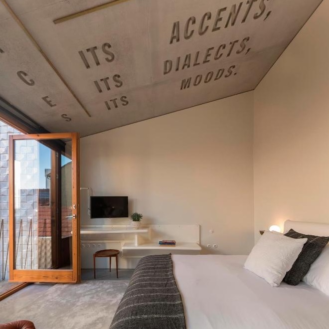 Like its sister hotel Casa do Conto, Tipografia do Conto puts a contemporary riff on a historic Porto property. Once an industrial space for activities such as typography and graphic arts, the building has now entered a new chapter as a ten key hotel, but still retains its original details such as the stone façade. In the guest rooms, raw concrete ceilings have been inscribed with texts from various Portuguese and international authors in the fields of architecture, art and design, while wood paneling and rich leather vintage furnishings bring a warmth to the pared back white walls. Facilities include a garden, central courtyard, outdoor pool, and bar Hífen, which also hosts a rotating program of exhibitions, concerts and cultural events.