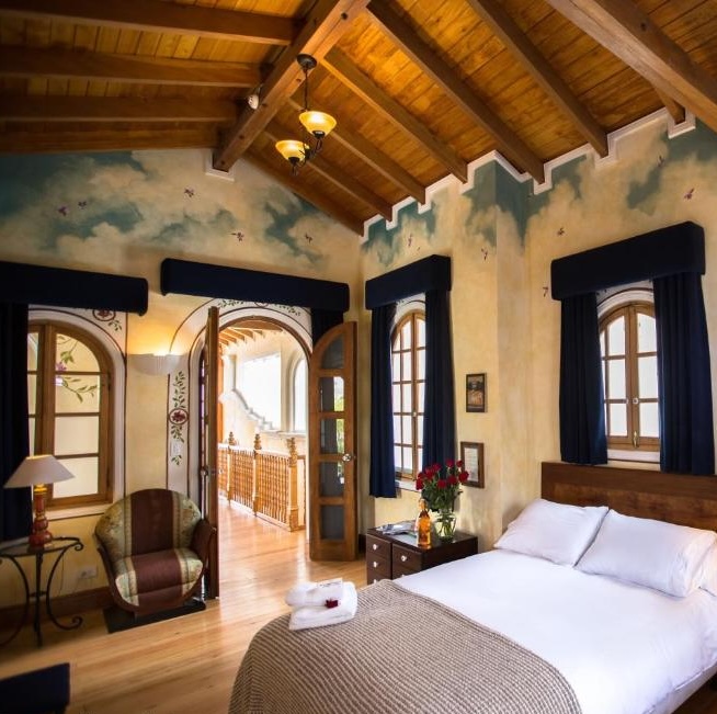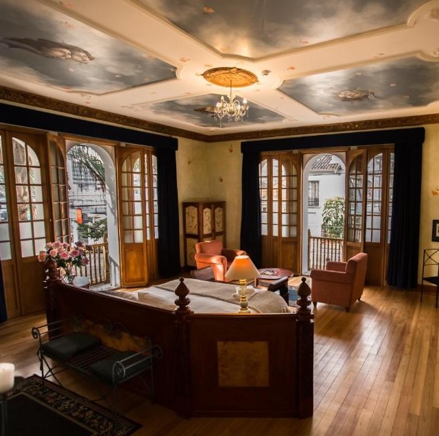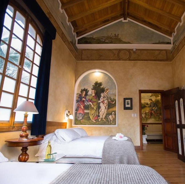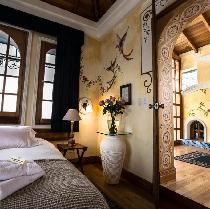 This restored Republican-era manor in Quito's historic center operates as a private residence with guest rooms. Only a handful of suites occupy the property, each individually designed with Botticelli-inspired frescoes and explorer-themed murals that give the place an eccentric, almost dreamlike quality. The standout Eros Penthouse Suite features a pyramid-shaped wooden ceiling and a terrace overlooking the Gothic Saint Teresa Cathedral. Garden-facing rooms offer contemplative stays among lush surroundings. The emphasis here is on intimacy and character over standard luxury trappings: expect handcrafted details, commissioned art, and the kind of personalized attention that comes with truly small-scale hospitality.